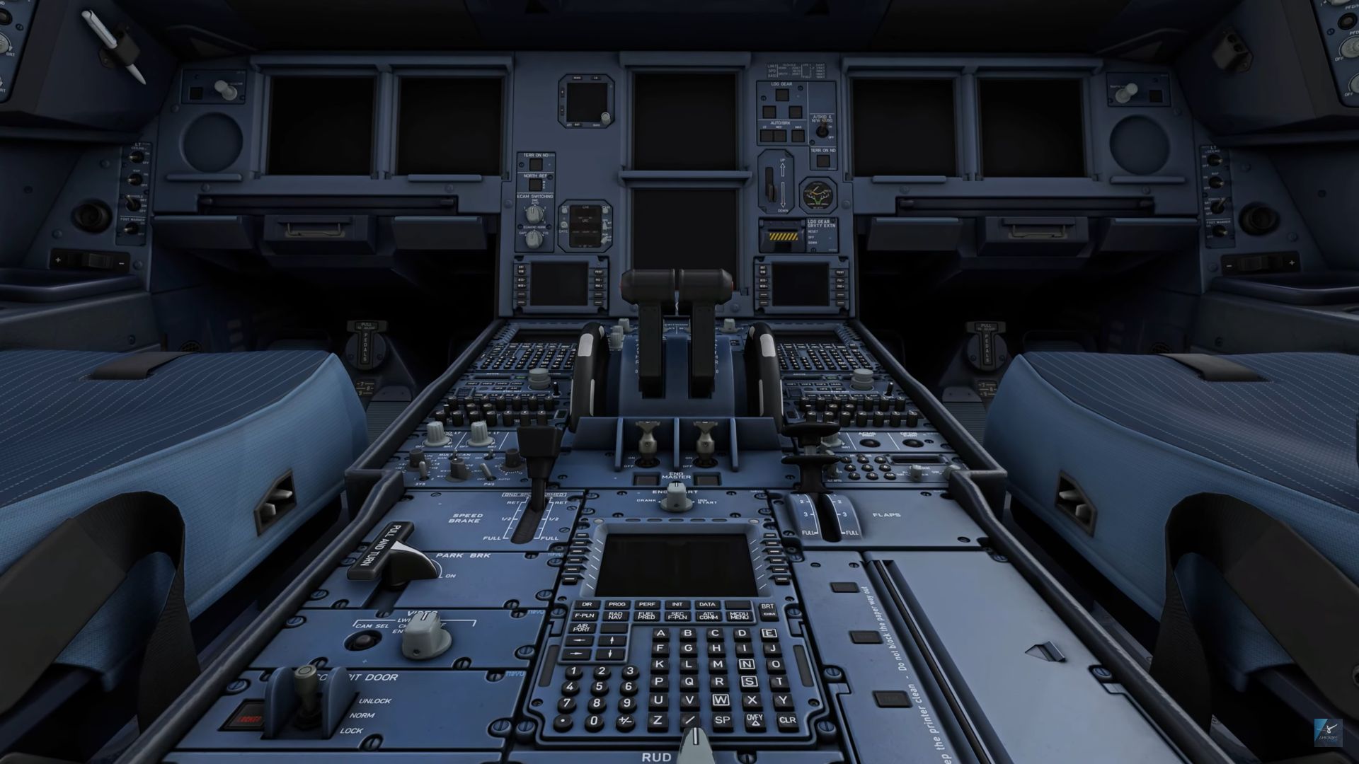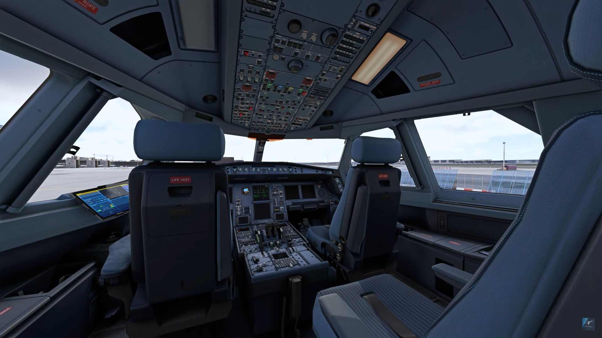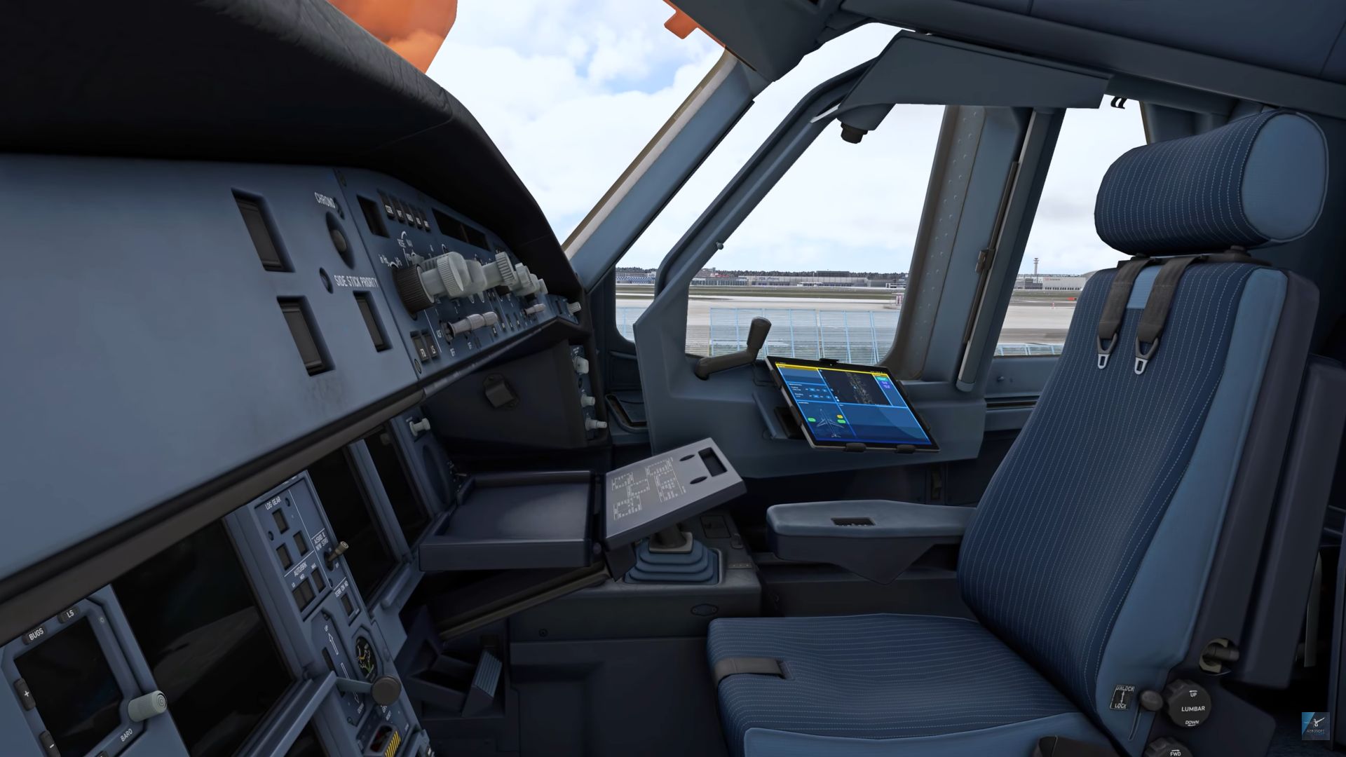 Im Cockpit beeindruckt die hohe Detailtreue: Alle Schalter, Knöpfe und Displays werden voll funktionsfähig sein. Das EFB (Electronic Flight Bag = Tablet im Cockpit) wird in eingeschaltetem Zustand gezeigt. Davon soll es in einem nächsten Video mehr zu sehen geben, verspricht Rafi.