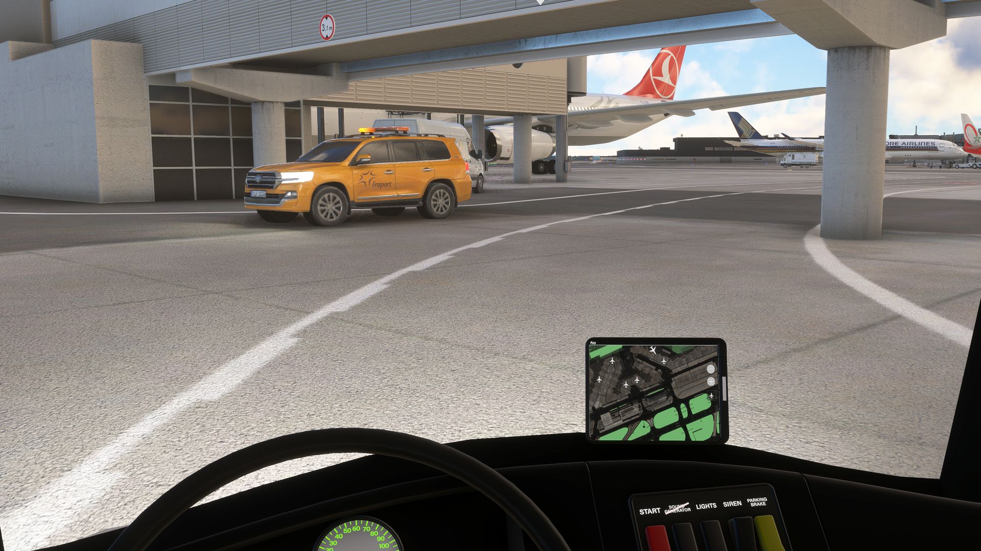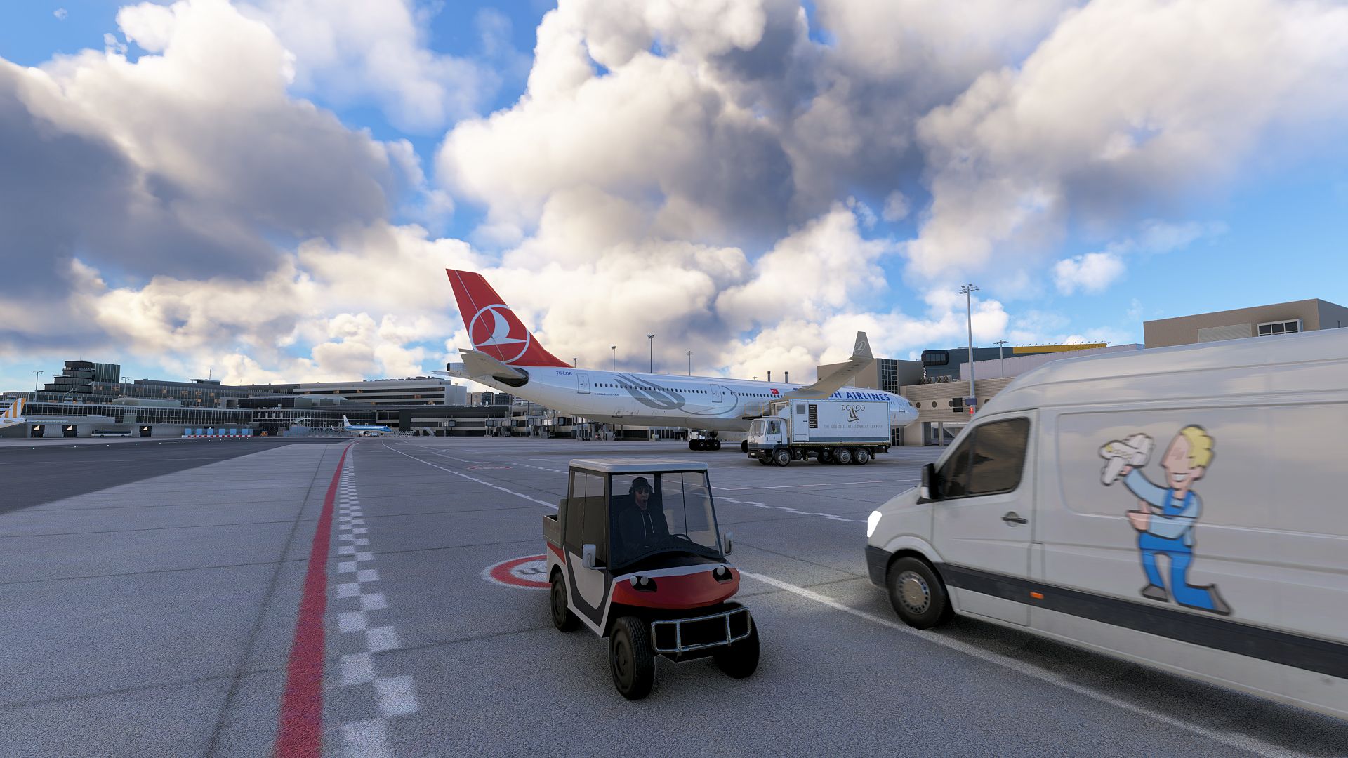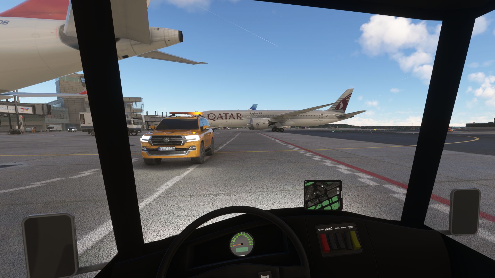 Ich habe mich deshalb in meinen kostenlosen Flughafen-Buggi geschmissen (Freeware dazu hier) und bin sage und schreibe eine ganze Stunde am Airport herumgekurvt. In völlig neuer Perspektive. Jetzt mag so mancher ernsthafte Profi-Flugsimulant die Nase rümpfen. Aber ganz ehrlich: Hat Spaß gemacht.
