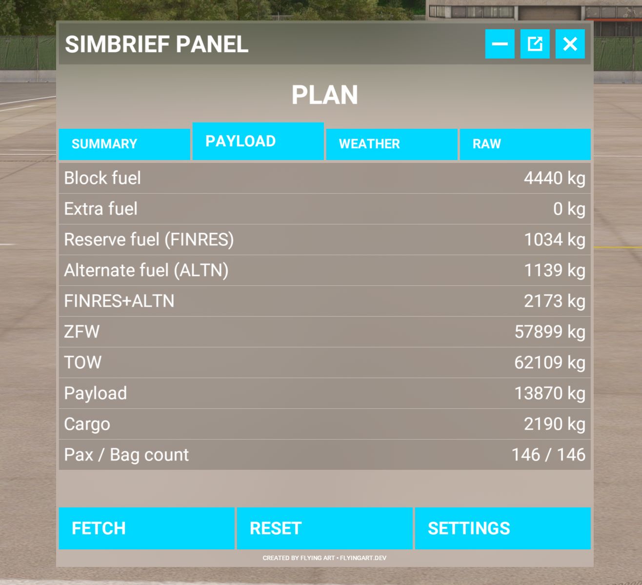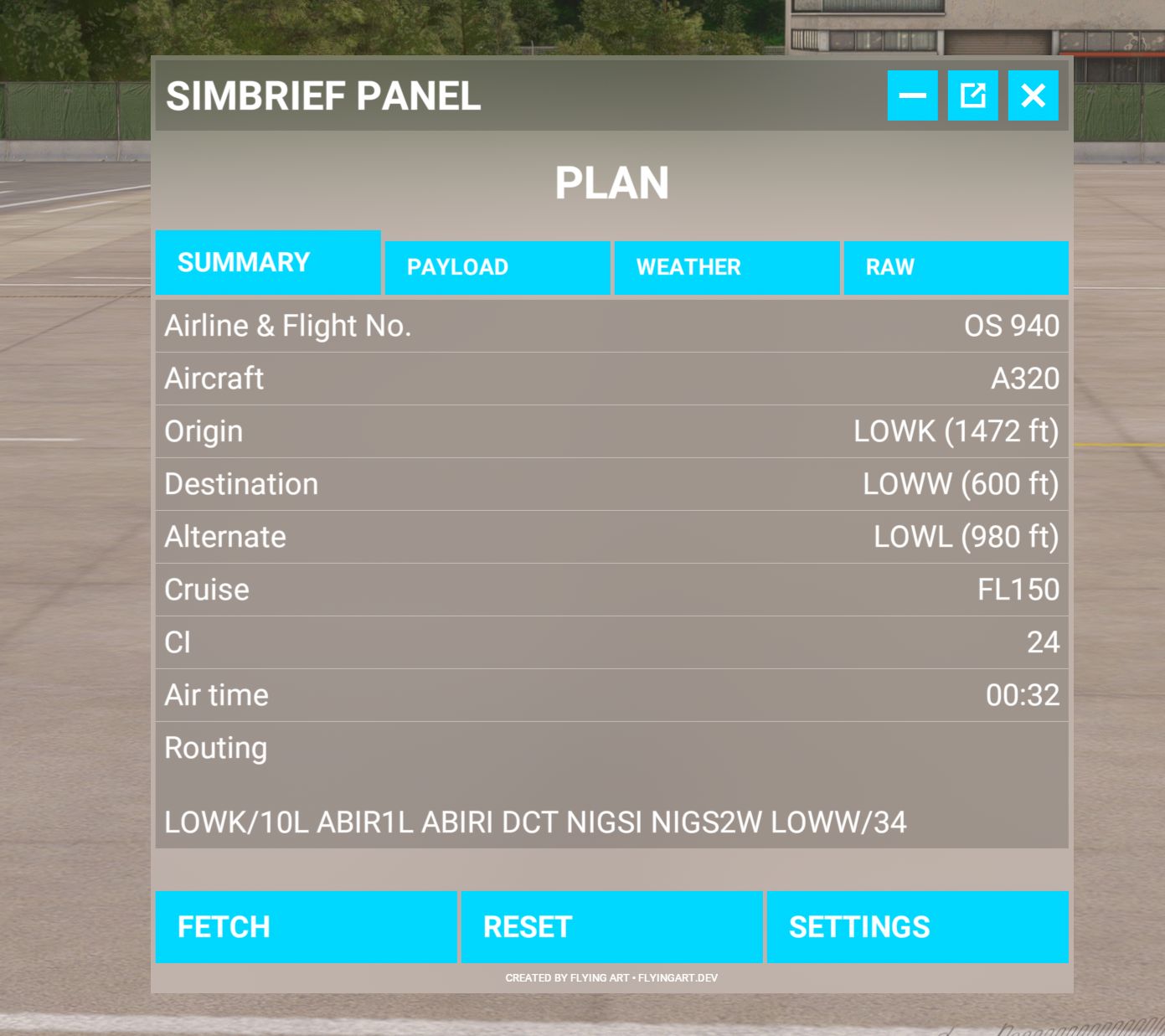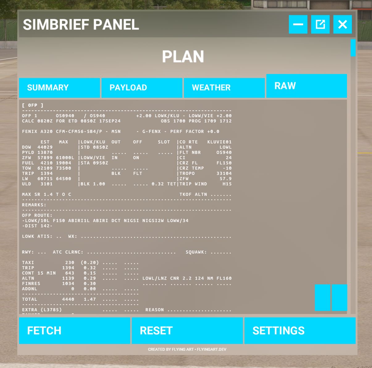 FSNews24 hat das Tool vor Längerem bereits einmal vorgestellt. Vor einiger Zeit wurden einige Änderungen und Erweiterungen eingebaut, sodass sich ein neuerlicher Blick darauf lohnt. Registerkarten mit den vier Bereichen Summary, Payload, Weather und RAW (für den OFP, also operational flight plan), sorgen nun für bessere Übersichtlichkeit der einzelnen Informationen.