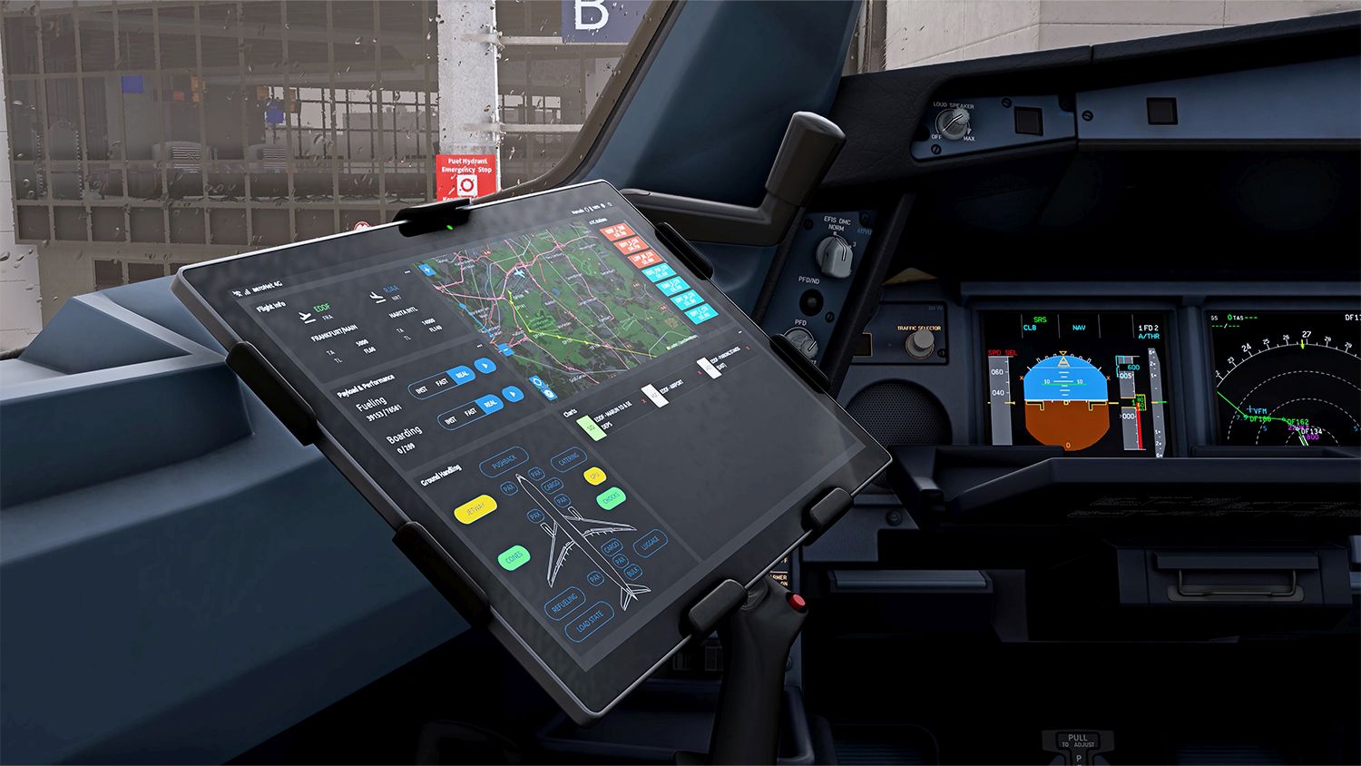 - Enthält ein Electronic Flight Bag, das Zugriff auf Bodenservice, Gewicht & Balance, Leistungsberechnung, SimBrief-Integration und Karten ermöglicht
