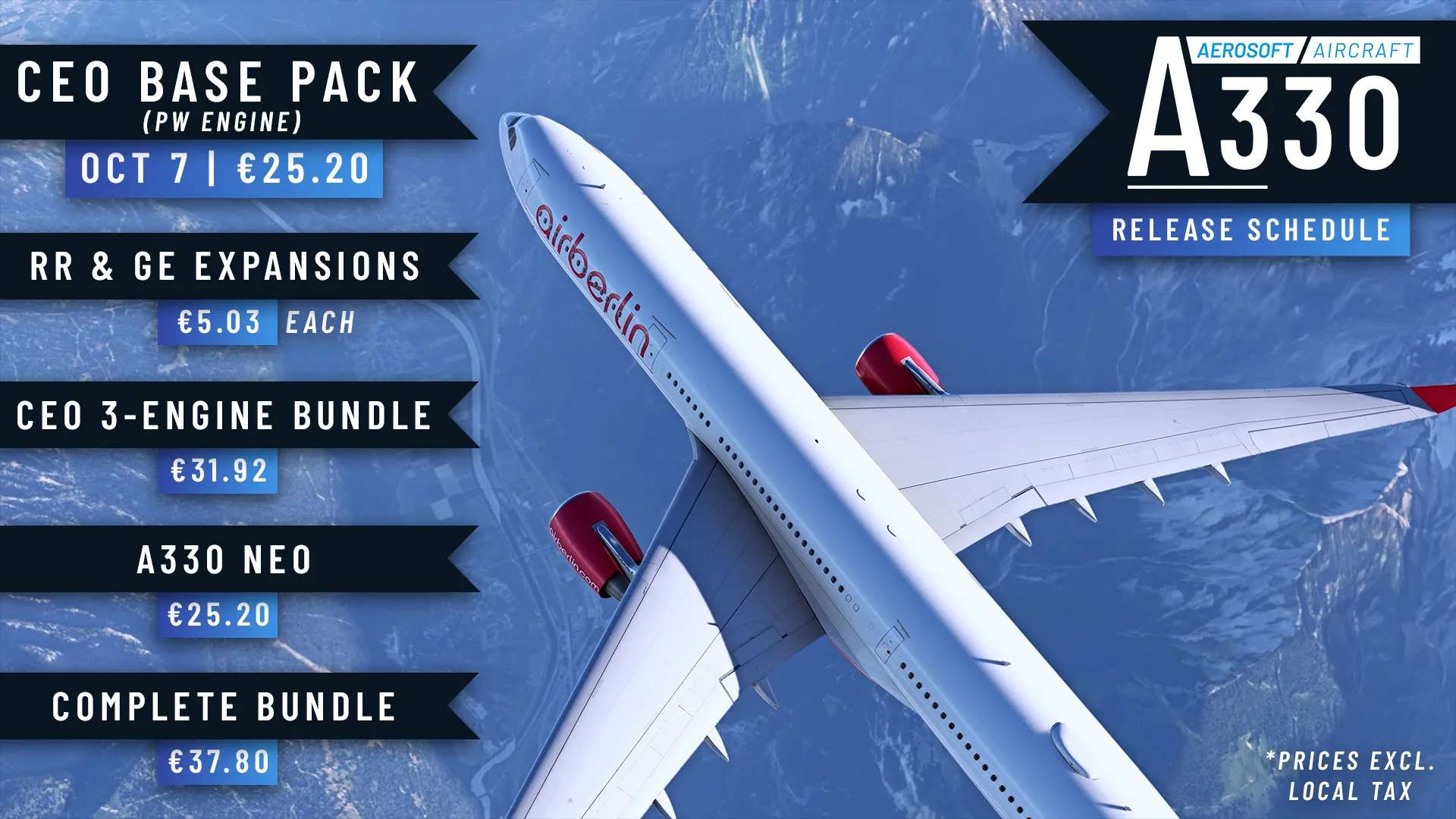 Ein Update auf den MSFS 2024 mit weiteren Features soll kostenlos nachgeliefert werden, verspricht Aerosoft. Und auch zu den weiteren Paketen, die zum A330 von Aerosoft noch kommen sollen, wurde heute schon ein Veröffentlichungsplan geteilt. Mit zusätzlichen Triebwerksvarianten, dem NEO und einem Komplettpaket.