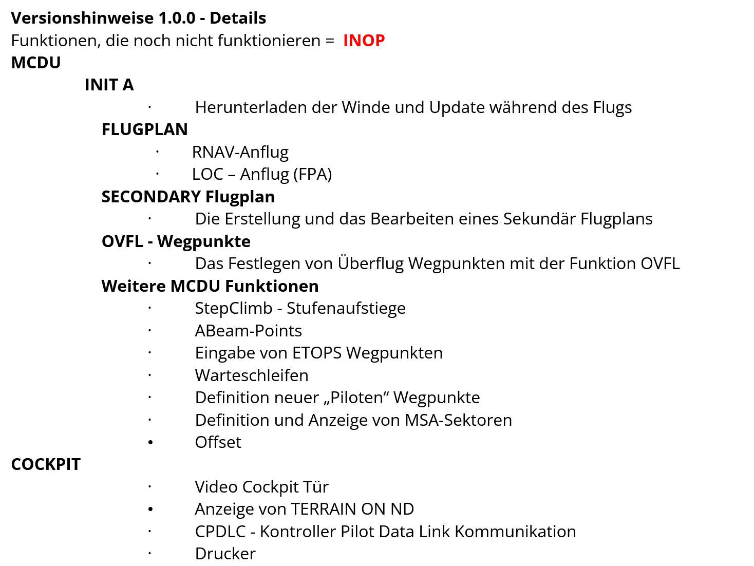 Auch in den einzelnen Kapiteln sind nicht umgesetzte Funktionen mit dem Kürzel INOP versehen.