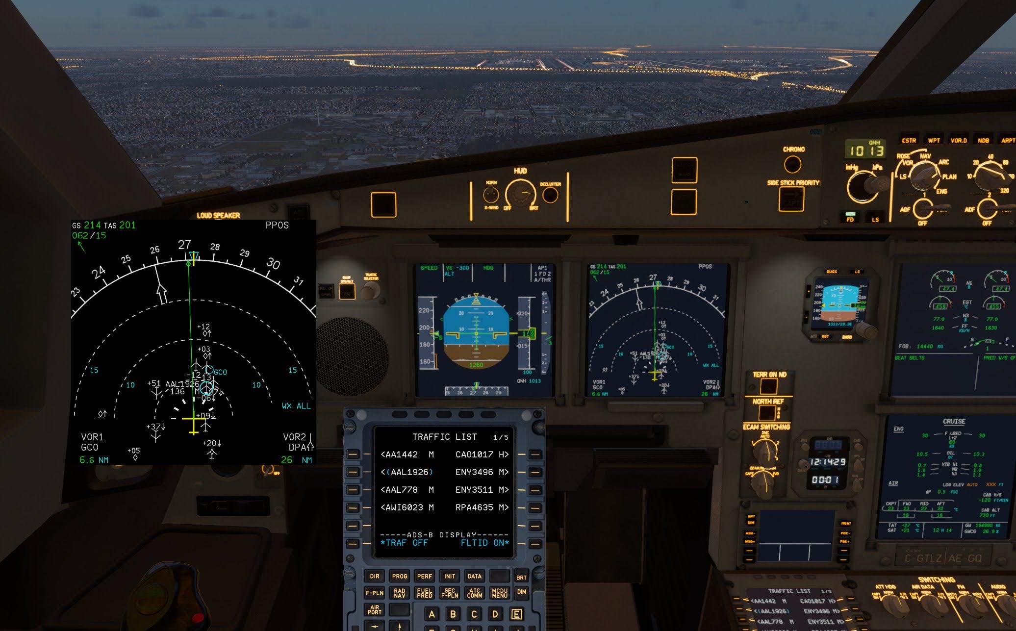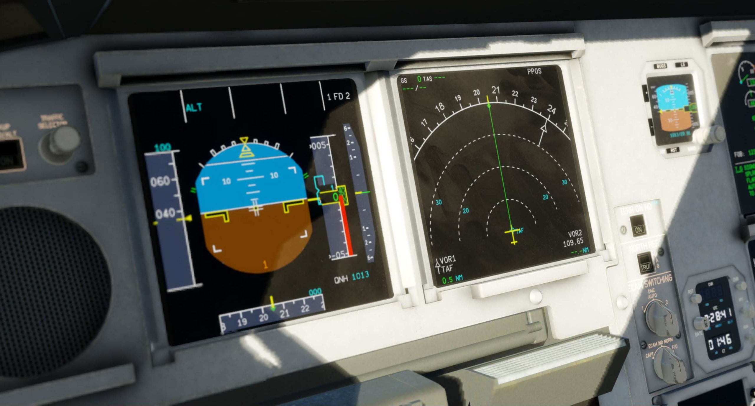 Und in der Tat verfügt der ToLiss A330 über etliche Funktionen, die man bei bislang veröffentlichten Umsetzungen des Langstreckengroßraumflugzeuges vermisst. Etwa ein Head-up-Display (HUD) sowohl auf der Piloten- als auch auf der Copilotenseite, das in allen Flugphasen alle relevanten Fluginformationen im Sichtfeld des Piloten bereitstellt. Ein Digital Radio und Audio Integrating Management System (DRAIMS), das eine einfachere Verwaltung von Funkfrequenzen, Transpondereinstellungen sowie der Backup-Funknavigation ermöglicht. ATSAW – Airborne Traffic Situation Awareness mit detaillierten Informationen zum umliegenden Verkehr auf dem Navigationsdisplay (ND). ROW/ROPS – Runway Overrun Warnung und ein Runway Overrun Prevention System, das die Besatzung warnt, wenn die verfügbare Landebahnlänge für eine sichere Landung nicht mehr ausreicht. TOS – Startüberwachung, die die Besatzung alarmiert, wenn sie versucht, von einer Rollbahn oder Landebahn zu starten, die nicht im FMS ausgewählt wurde. Und mehr…
