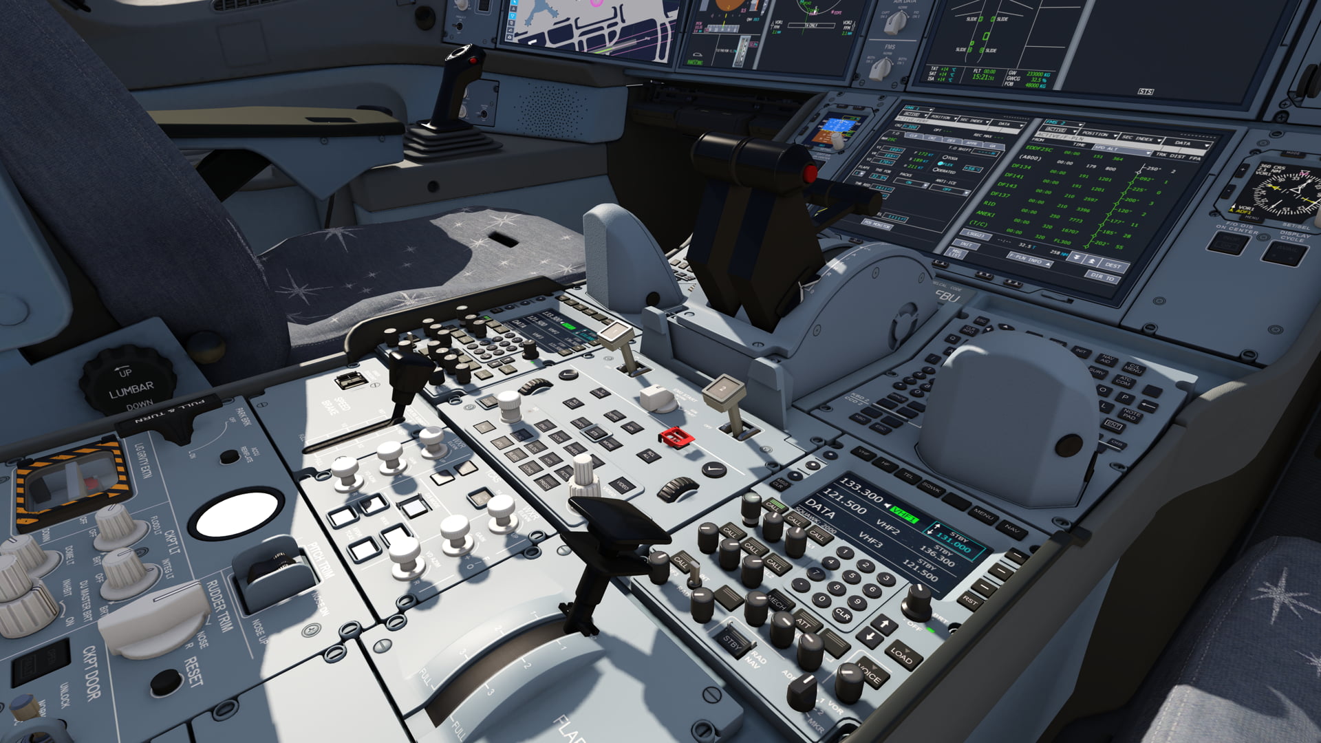 Beim A350 handelt es sich um ein modernes Großraumflugzeug mit Fly-by-Wire-Steuerung und hoher Systemautomatisierung. In der Simulation ist der A350 mit einem interaktiven Cockpit ausgestattet, das einen Start aus dem „Cold and Dark“-Zustand ermöglicht. Verschiedene Funktionen wie Head-Up-Display, Taxi-Kamera, Airport-Chart und interaktive Touchscreens stehen zur Verfügung.