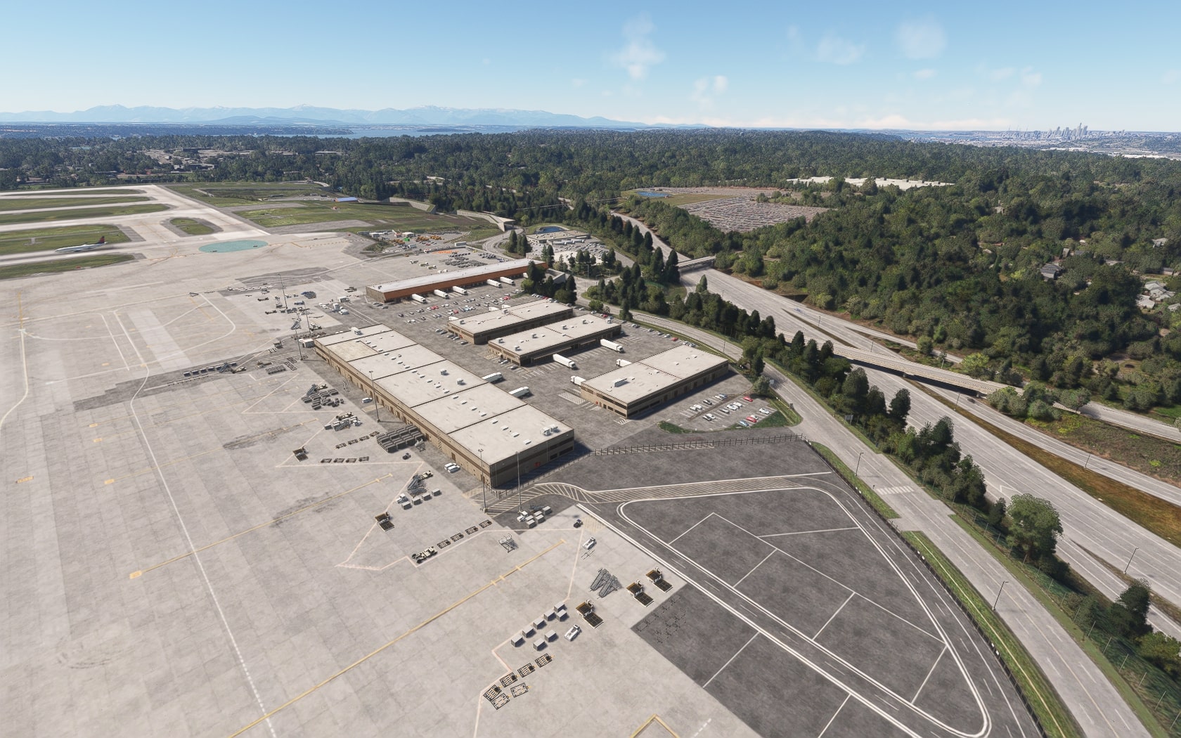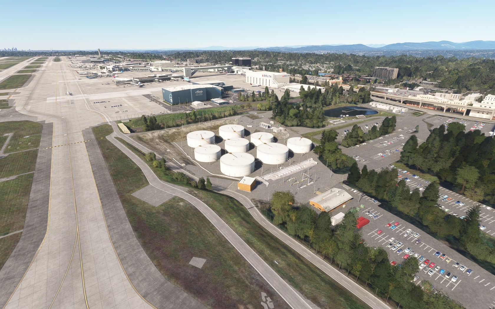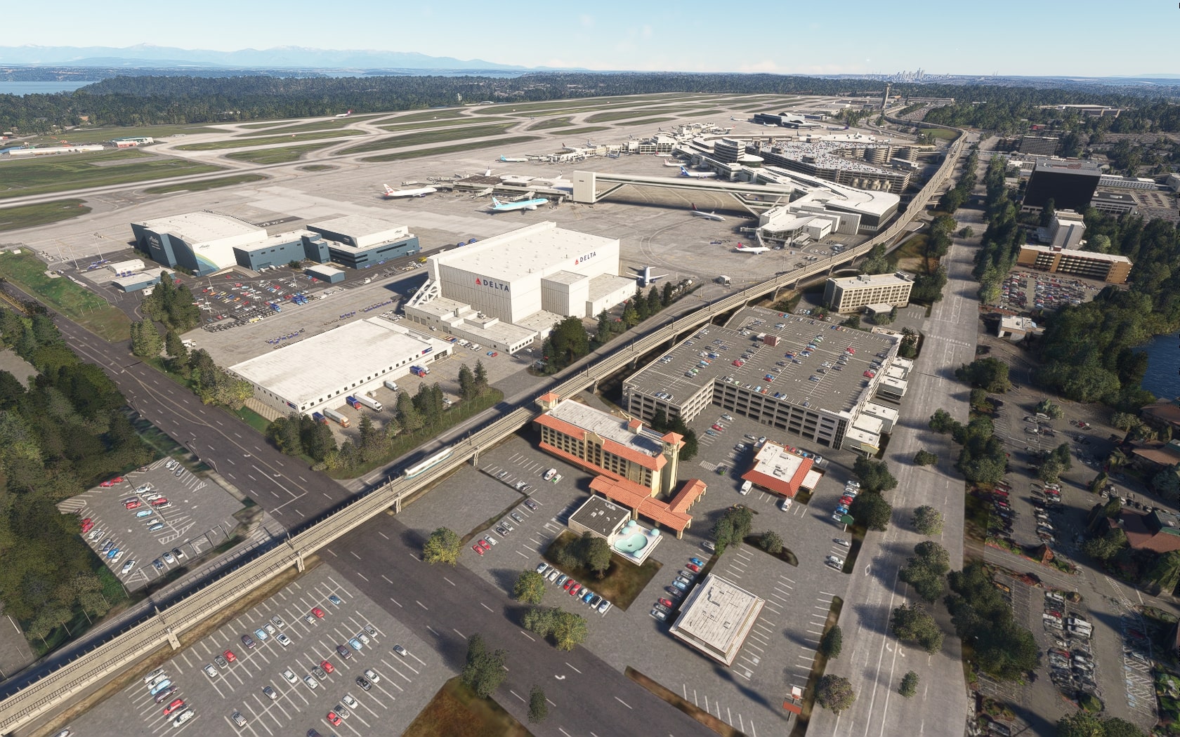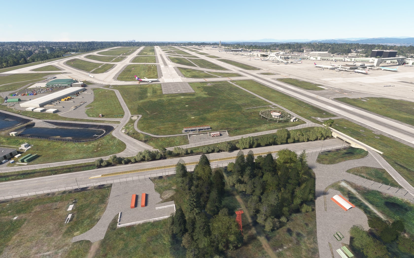 Die South 188th Street, die die 34R und den Taxiway B in einem Tunnel unterquert, wurde sehenswert plastisch umgesetzt. FT und MKS lassen das (Doppler-)VOR/DME SEATTLE SEA 116,80 MHz gegenüber des Rollwegs SIERRA (S) als 3D-Modell mit durchsichtiger Drahtkonstruktion der Rundantenne (BA zeigt eine undurchsichtige Antenne-„Platte“) glänzen und die Line 1 der Straßenbahn bis zu erwähnten Verlängerung fahren. Der Boden sieht mit Schmutzspuren versehen plausibel gebraucht aus.