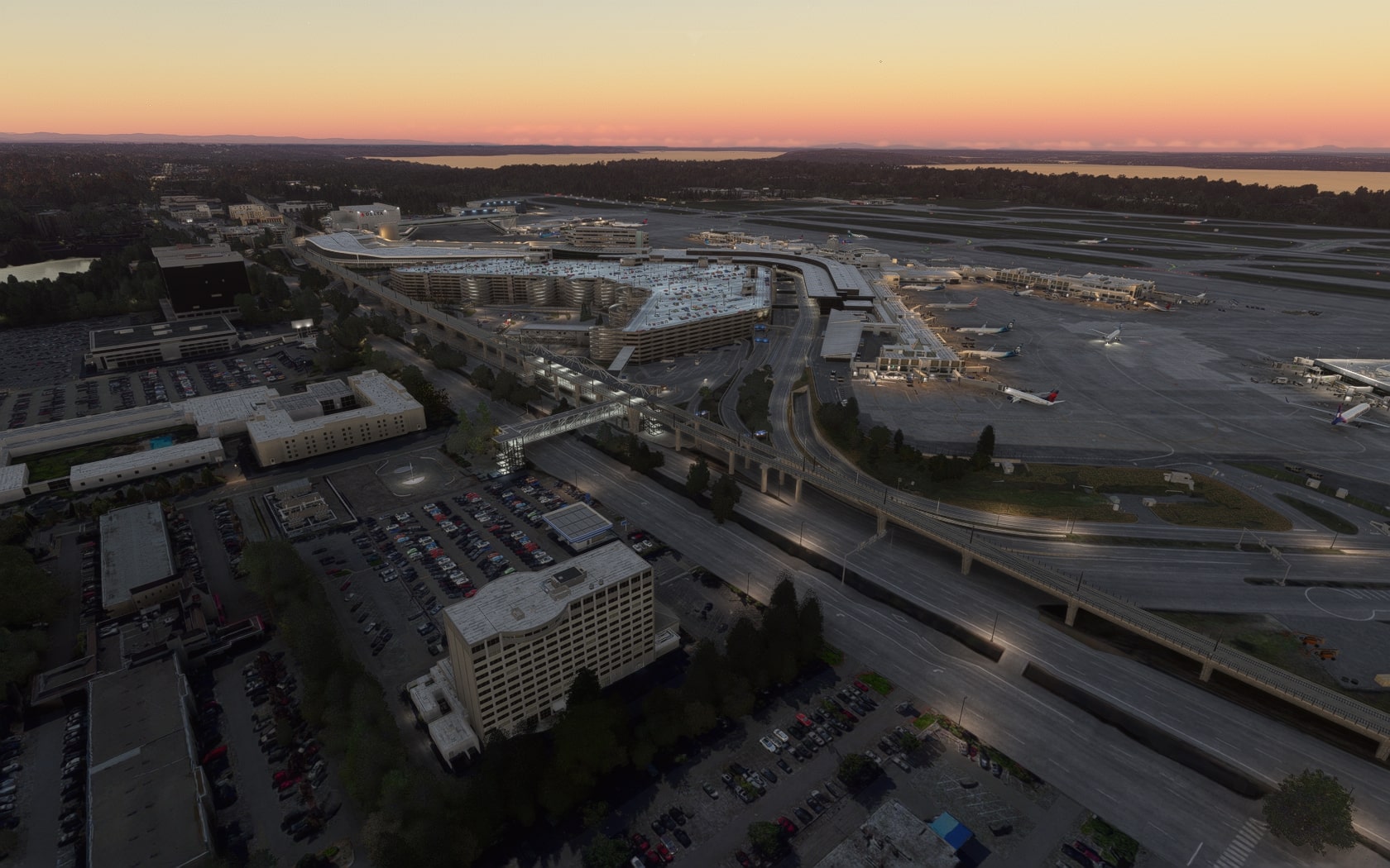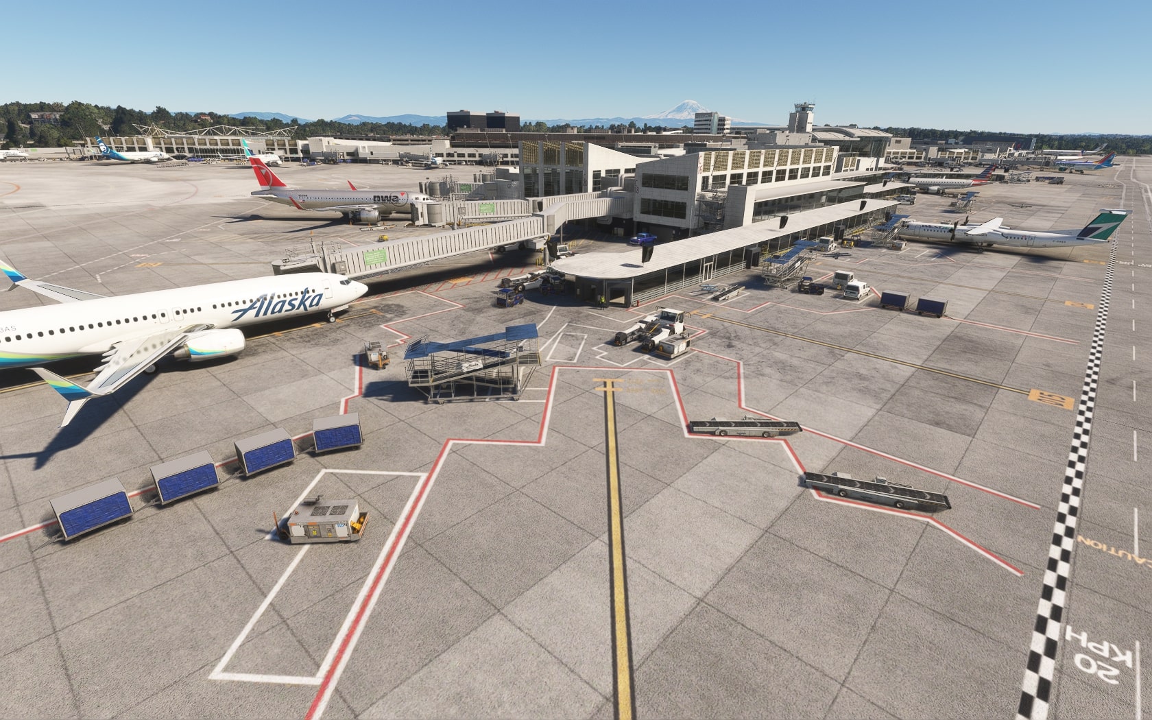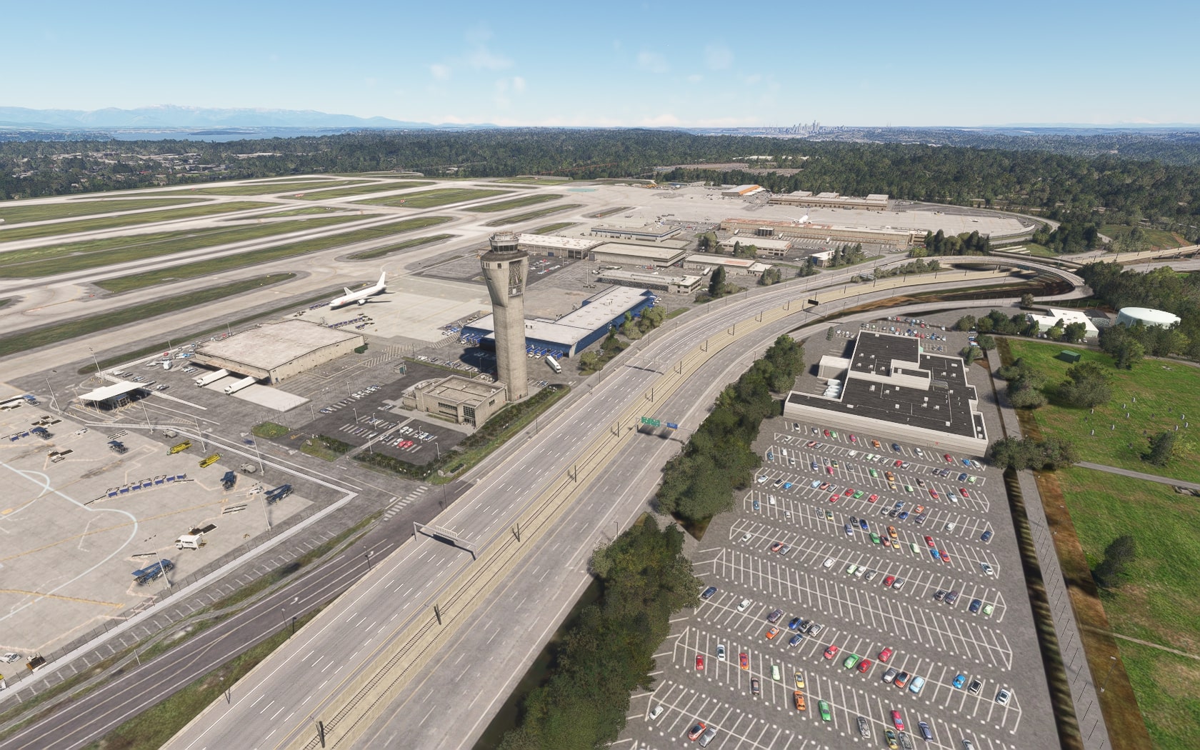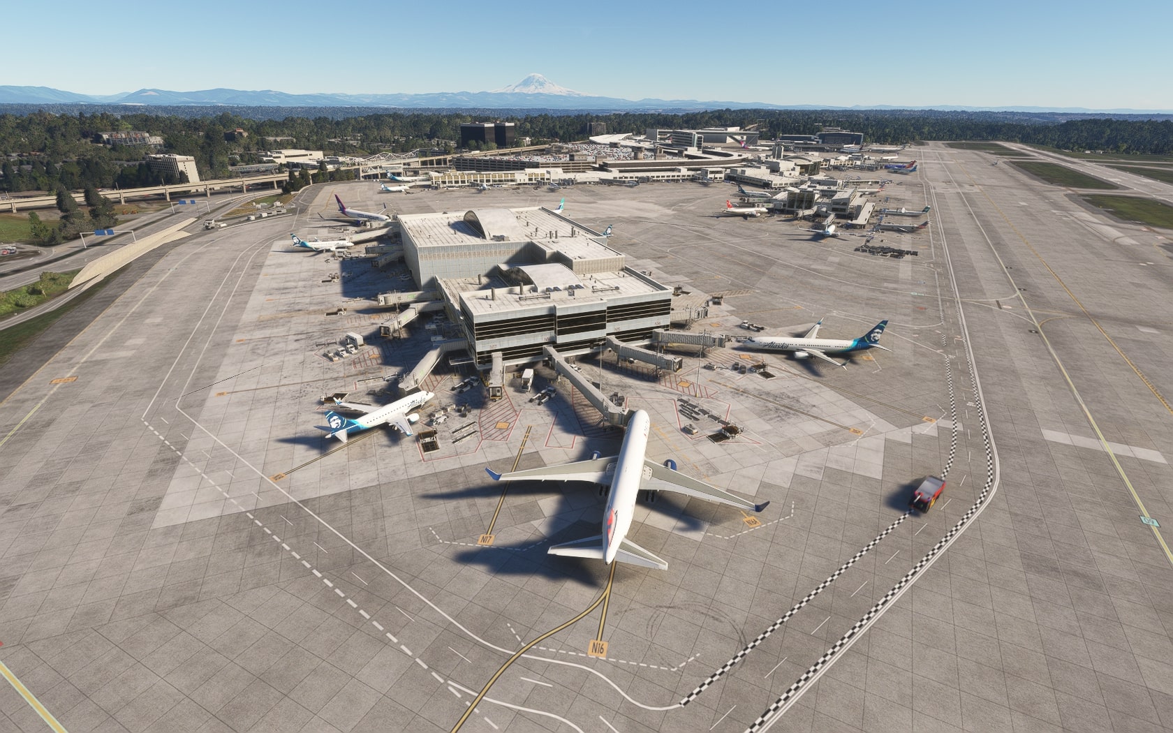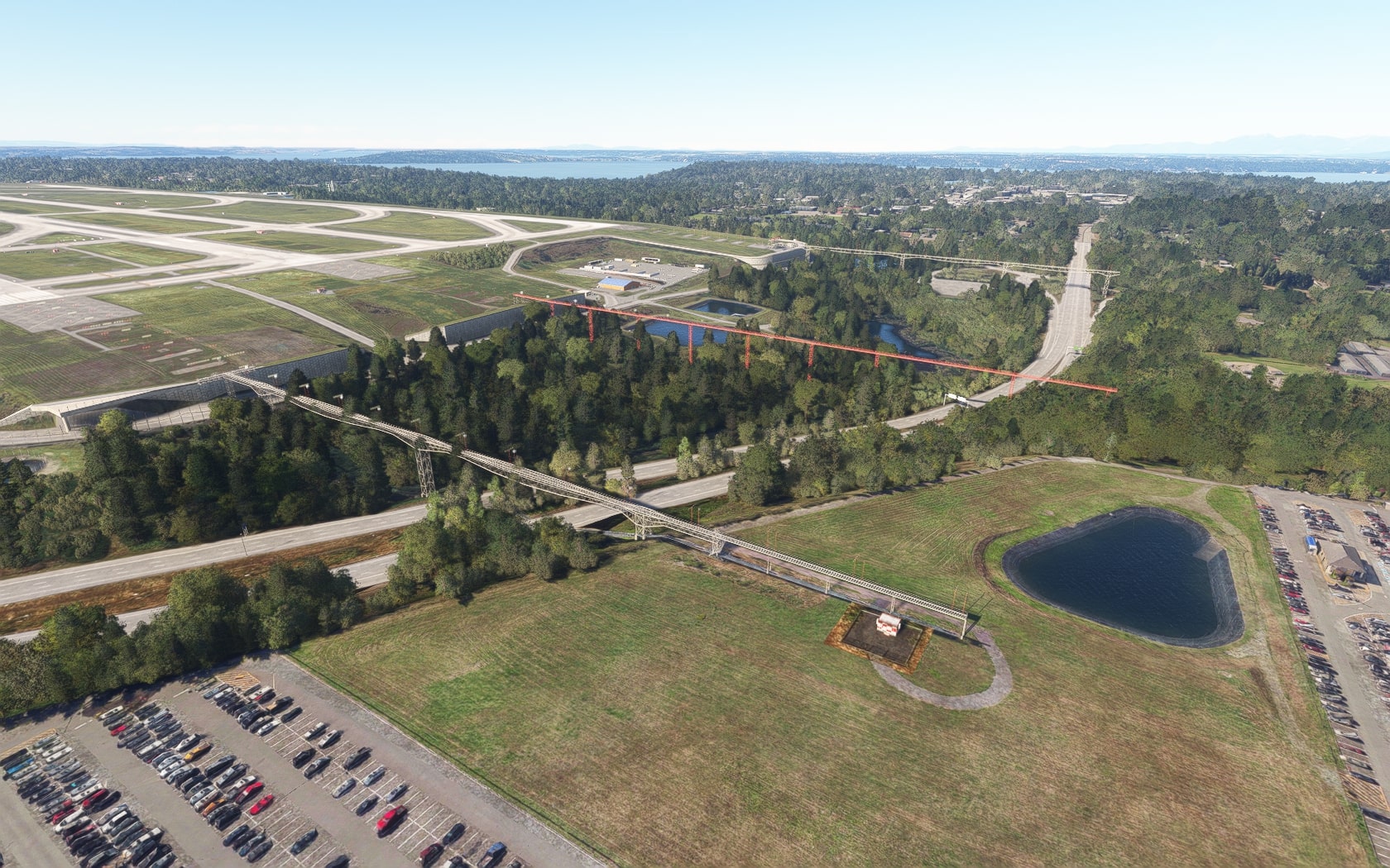Die South 188th Street, die die 34R und den Taxiway B in einem Tunnel unterquert, wurde sehenswert plastisch umgesetzt. FT und MKS lassen das (Doppler-)VOR/DME SEATTLE SEA 116,80 MHz gegenüber des Rollwegs SIERRA (S) als 3D-Modell mit durchsichtiger Drahtkonstruktion der Rundantenne (BA zeigt eine undurchsichtige Antenne-„Platte“) glänzen und die Line 1 der Straßenbahn bis zu erwähnten Verlängerung fahren. Der Boden sieht mit Schmutzspuren versehen plausibel gebraucht aus.