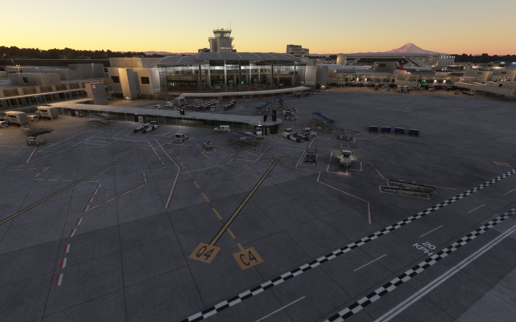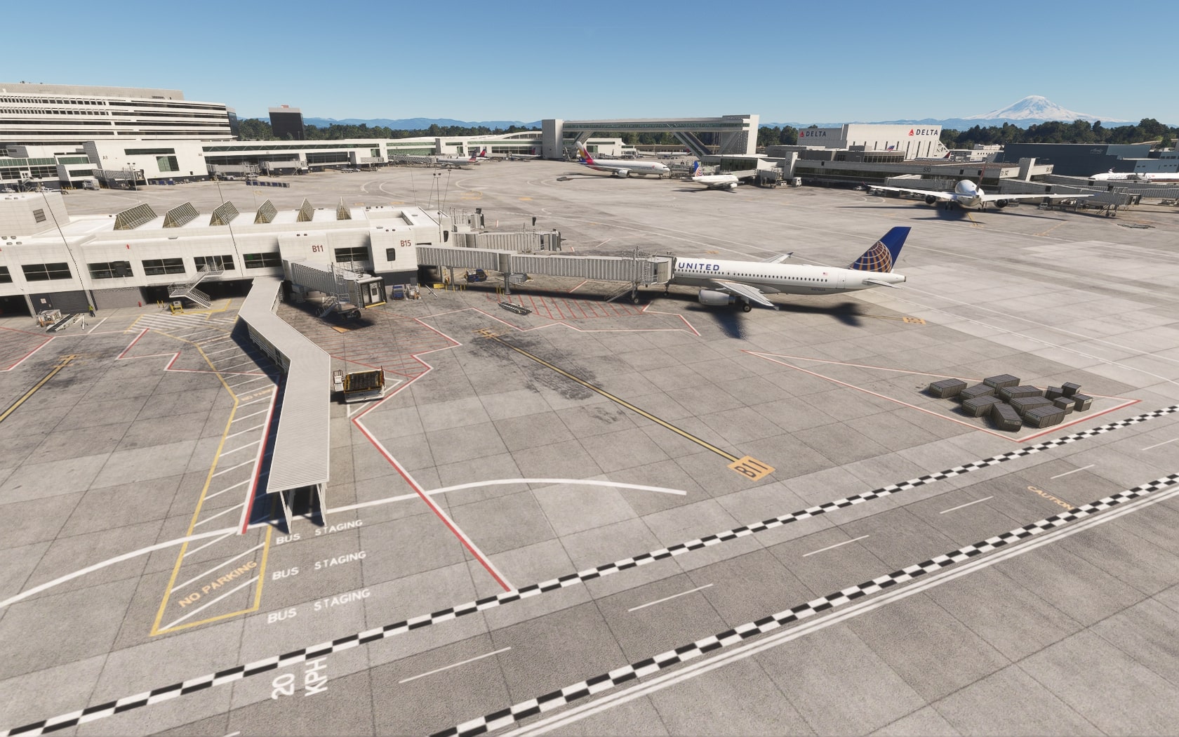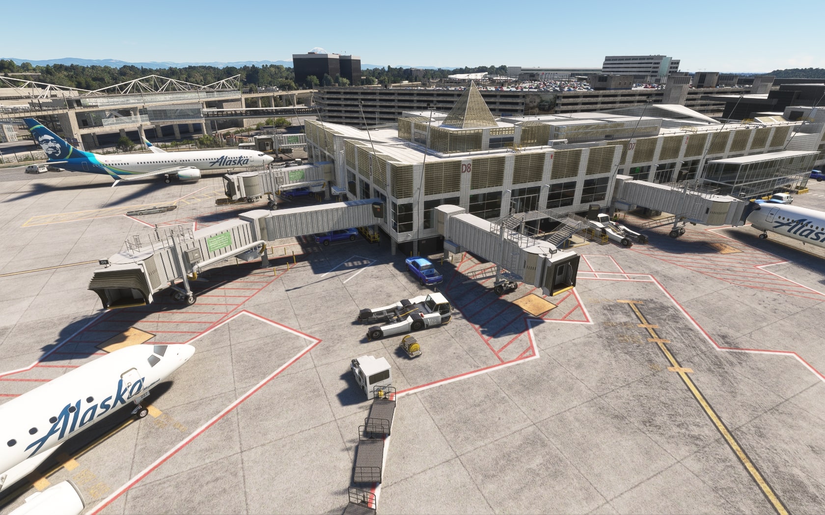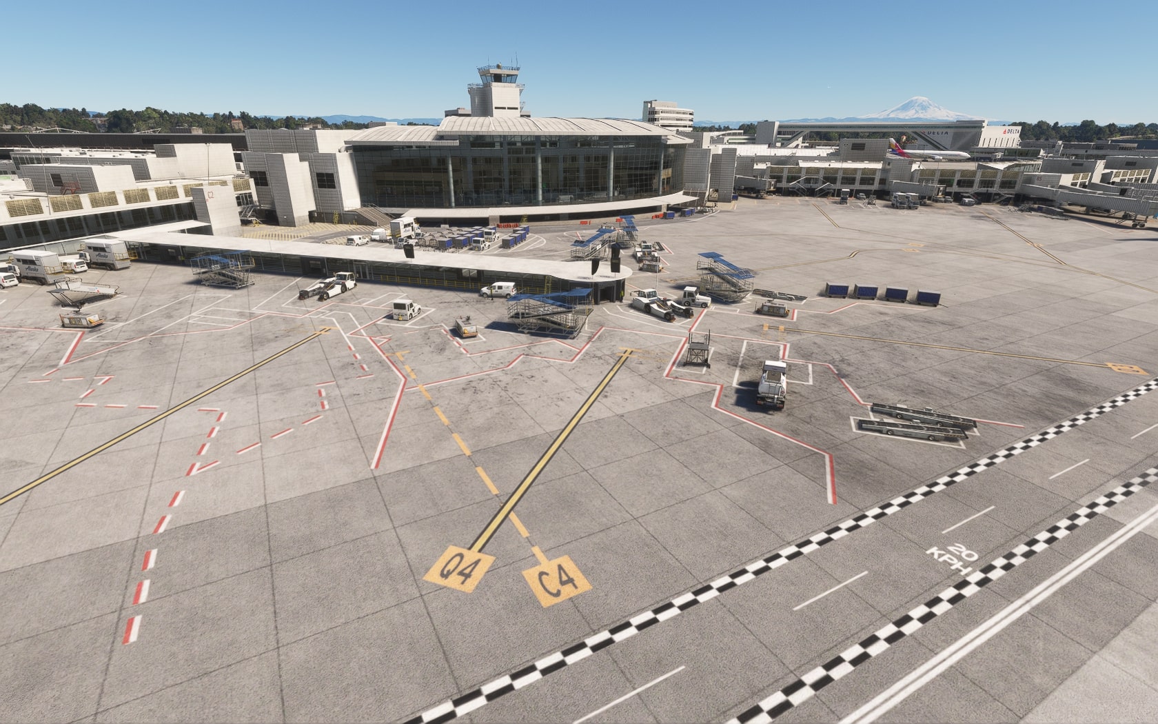Die South 188th Street, die die 34R und den Taxiway B in einem Tunnel unterquert, wurde sehenswert plastisch umgesetzt. FT und MKS lassen das (Doppler-)VOR/DME SEATTLE SEA 116,80 MHz gegenüber des Rollwegs SIERRA (S) als 3D-Modell mit durchsichtiger Drahtkonstruktion der Rundantenne (BA zeigt eine undurchsichtige Antenne-„Platte“) glänzen und die Line 1 der Straßenbahn bis zu erwähnten Verlängerung fahren. Der Boden sieht mit Schmutzspuren versehen plausibel gebraucht aus.