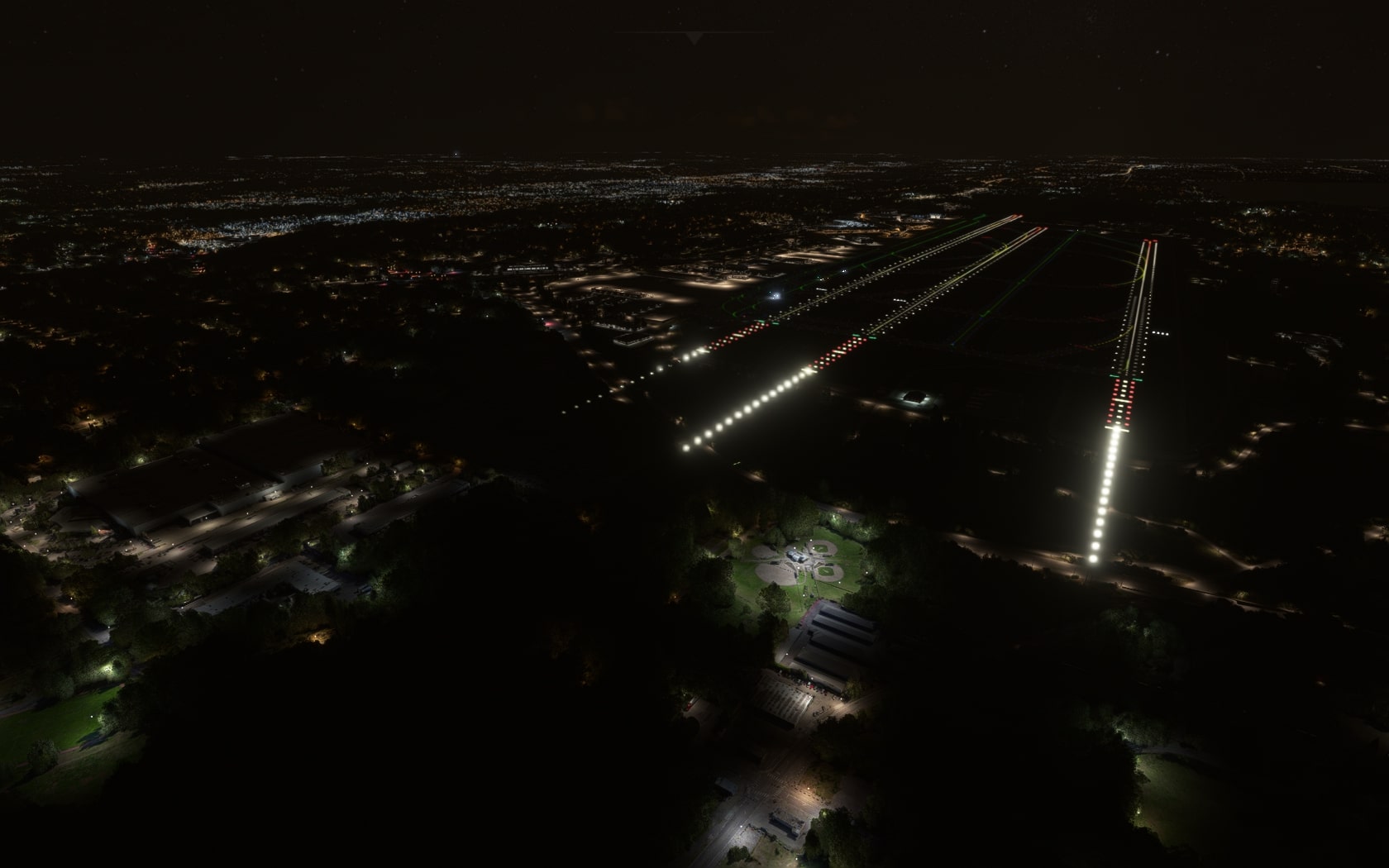 Auch bei dieser Szenerie konnten keine Probleme mit den sechs Instrumentenlandesystemen oder „Schlaglöcher“ in den Run- und Taxiways gefunden werden. Lediglich im Frachtbereich gibt es eine Unebenheit. Die drei Anfugbefeuerungen der Runways 16L/C/R des Typs ALSF-II führen auch MKS als filigran-plastische 3D-Modelle über die tiefer liegenden Straßen im Norden des Airport-Plateaus – und das umn einen qualitativen „Ticken“ besser als die Mitbewerber. MKS zeigt die LOCALIZER-Antenne der ILS der 16R und 34L sehenswert auf erhöhten Bühnen. Das macht auch FT, doch unterschlägt, dass diese Bühne den Höhenunterschied zur Bahn des hier nach Norden und Süden hin abfallenden Geländes egalisiert, denn bei FT ist dieses Gelände flach. Nicht so bei MKS.