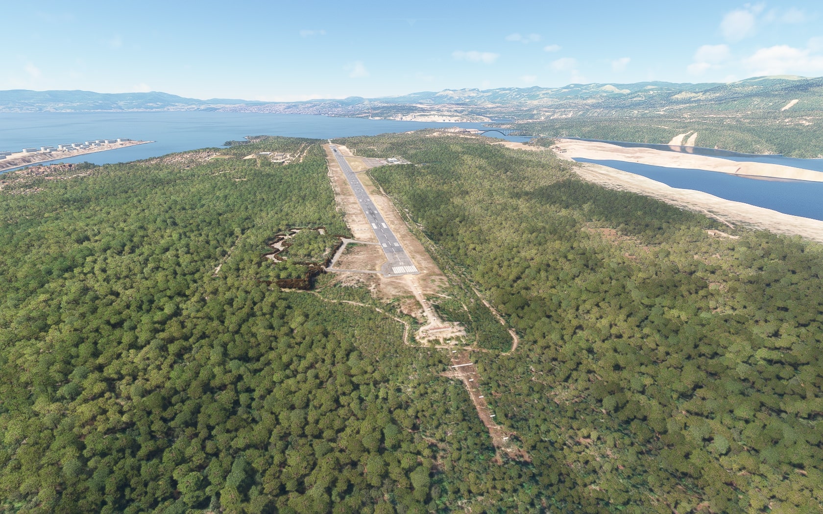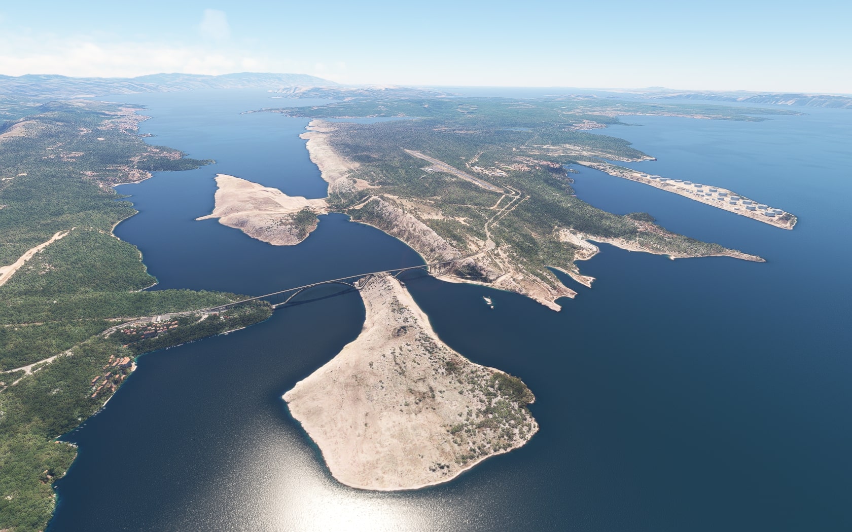 Die Krk-Brücke(n) und die Raffinerie werden ebenfalls dargestellt, das noch recht neue LNG-Terminal nicht. Es handelt sich um den MSFS-Standard, der teilweise im Wasser versinkt.