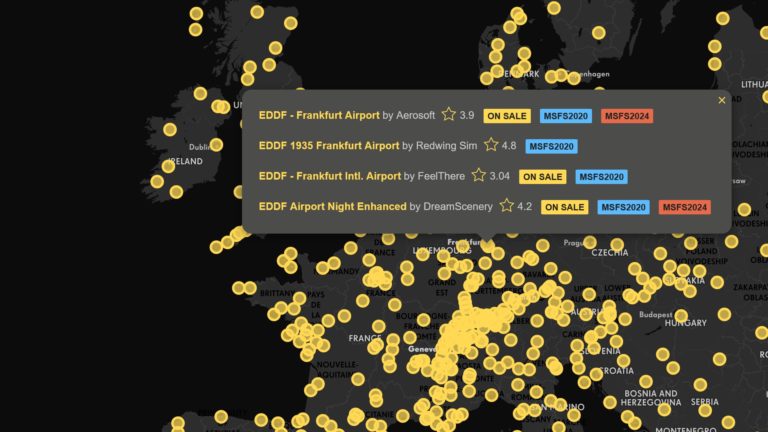 FS Addon Compare, eine Plattform zur Preisverfolgung von Add-ons für den Microsoft Flight Simulator 2020 und 2024, hat ein neues Feature veröffentlicht: eine Airport-Karte. Die Suche wird damit intuitiver. Nutzer können nun gezielt geografisch nach Airports stöbern. Beim Anklicken eines gelben Punktes öffnet sich das entsprechende Fenster und zeigt die einzelnen Angebote des jeweiligen Airports. … FS Addon: Preisvergleich jetzt mit interaktiver Karte weiterlesen