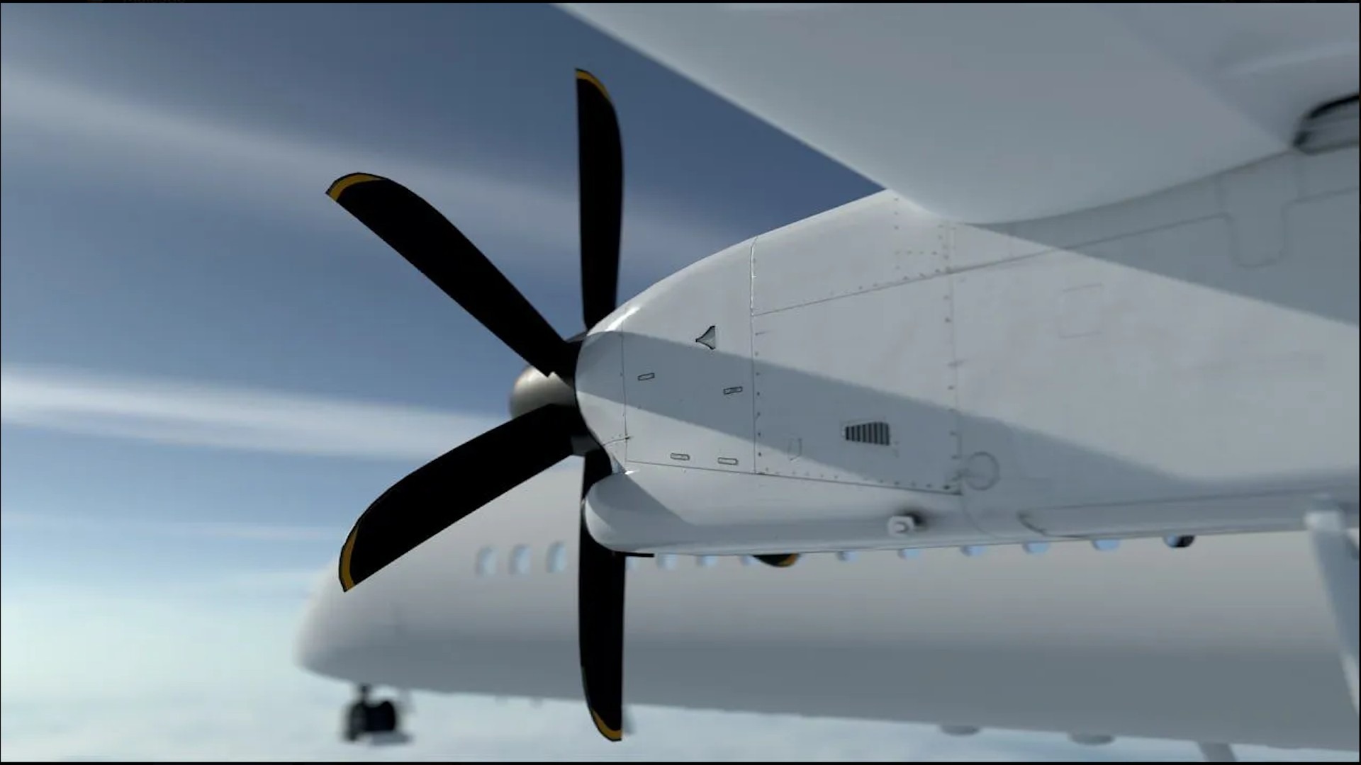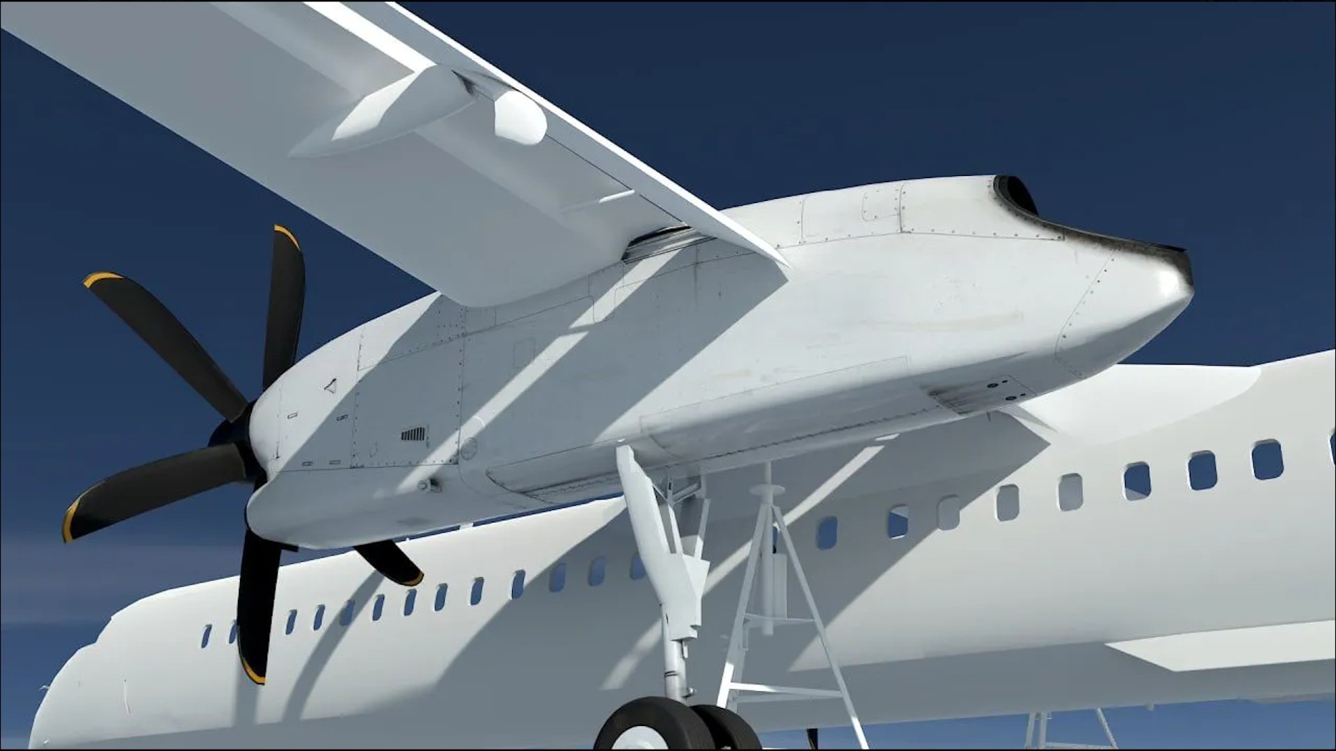 Kürzlich veröffentlichte Majestic im Forum erste offizielle 3D-Renderings der Q400 für den MSFS. Diese zeigen das virtuelle Flugzeugmodell in einem frühen Entwicklungsstadium – noch ohne Texturen oder Bemalung (Livery) und daher rein geometrisch dargestellt.