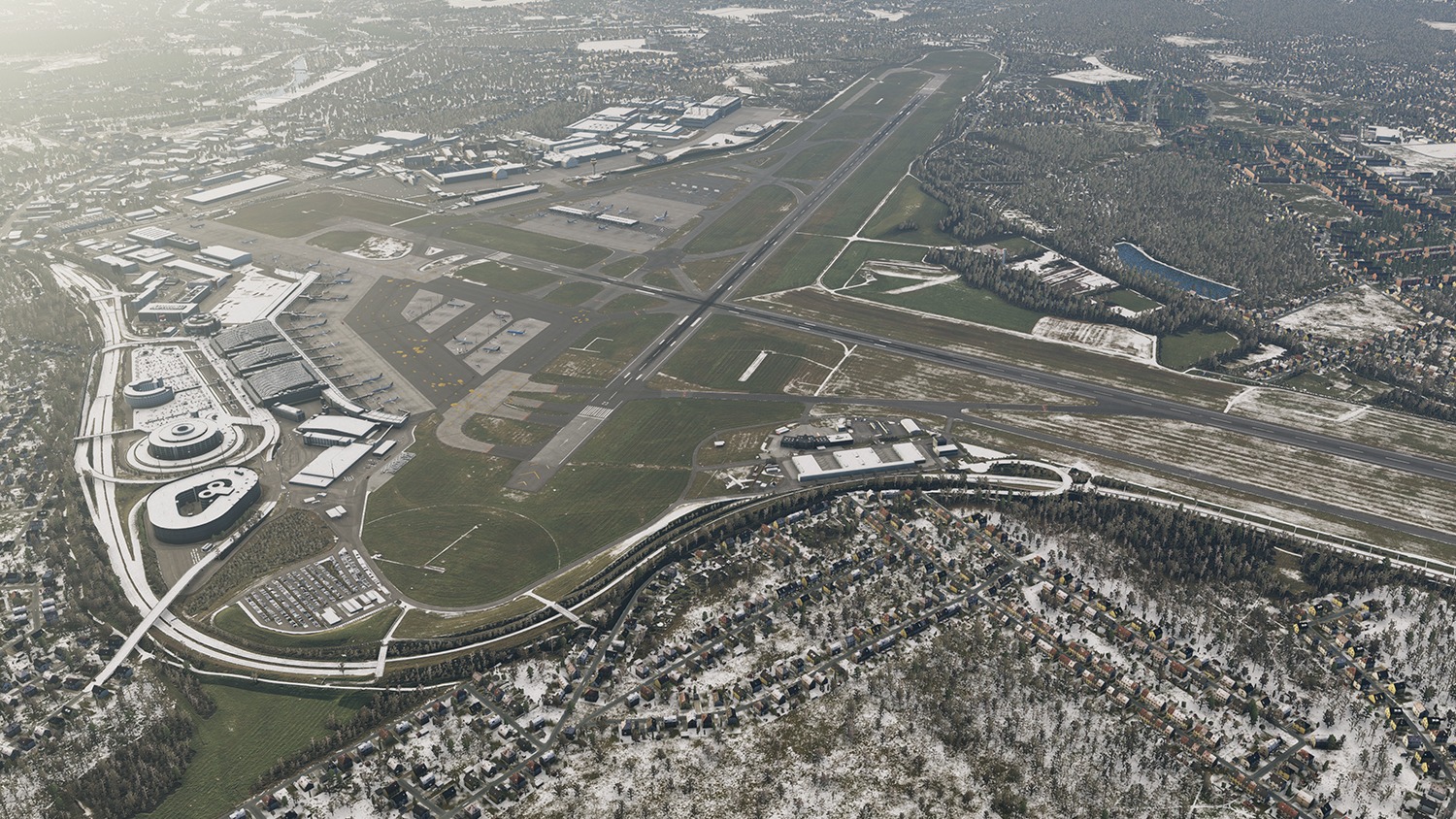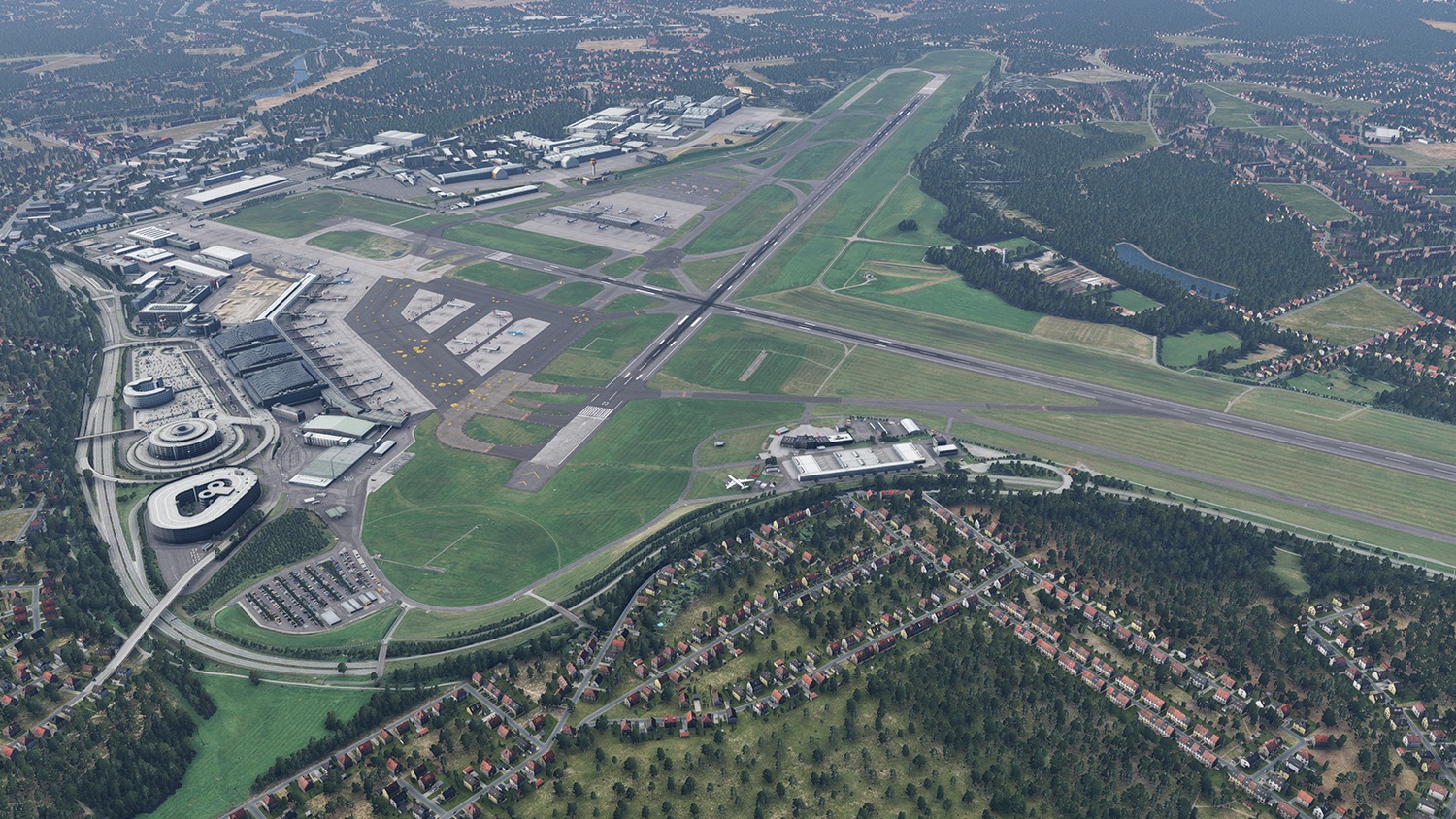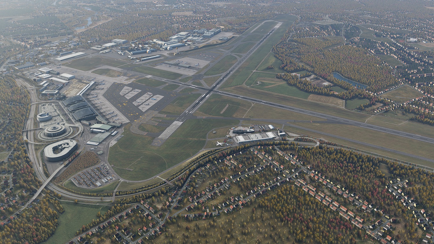Sämtliche Gebäude des Flughafens, einschließlich des Terminals mit Innenausbau, der Nebengebäude sowie des Lufthansa-Werftgeländes, wurden mit hoher Detailtiefe umgesetzt. Auch das neue Interims-Terminal sowie zusätzliche Standplätze wurden basierend auf aktuellen Bodenlayoutdaten des Flughafenbetreibers platziert.