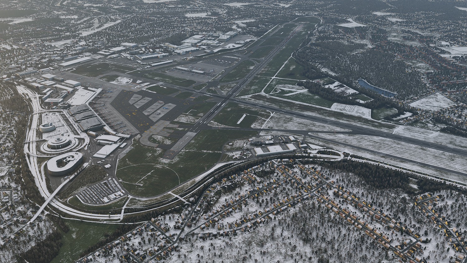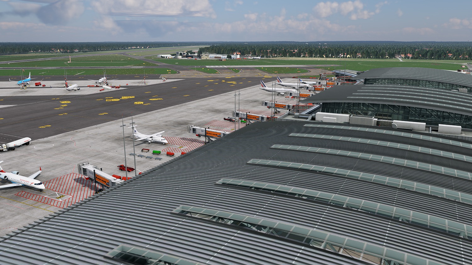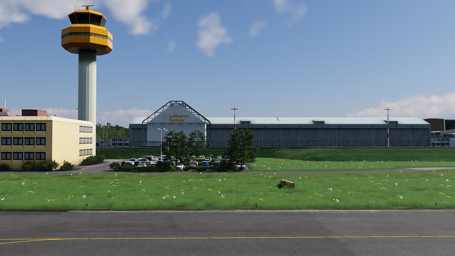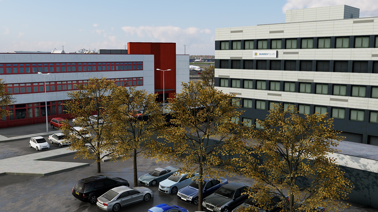 Sämtliche Gebäude des Flughafens, einschließlich des Terminals mit Innenausbau, der Nebengebäude sowie des Lufthansa-Werftgeländes, wurden mit hoher Detailtiefe umgesetzt. Auch das neue Interims-Terminal sowie zusätzliche Standplätze wurden basierend auf aktuellen Bodenlayoutdaten des Flughafenbetreibers platziert.