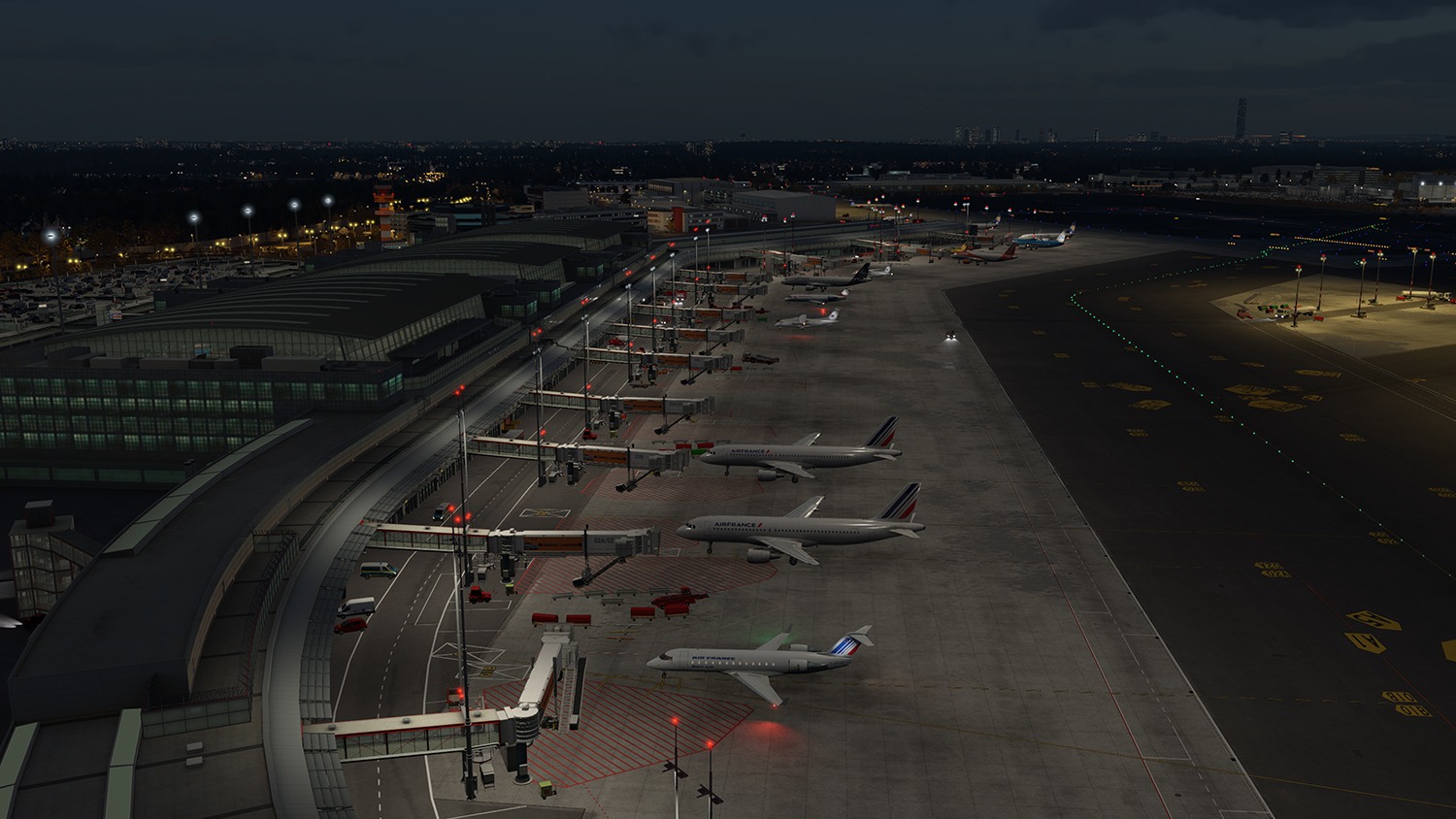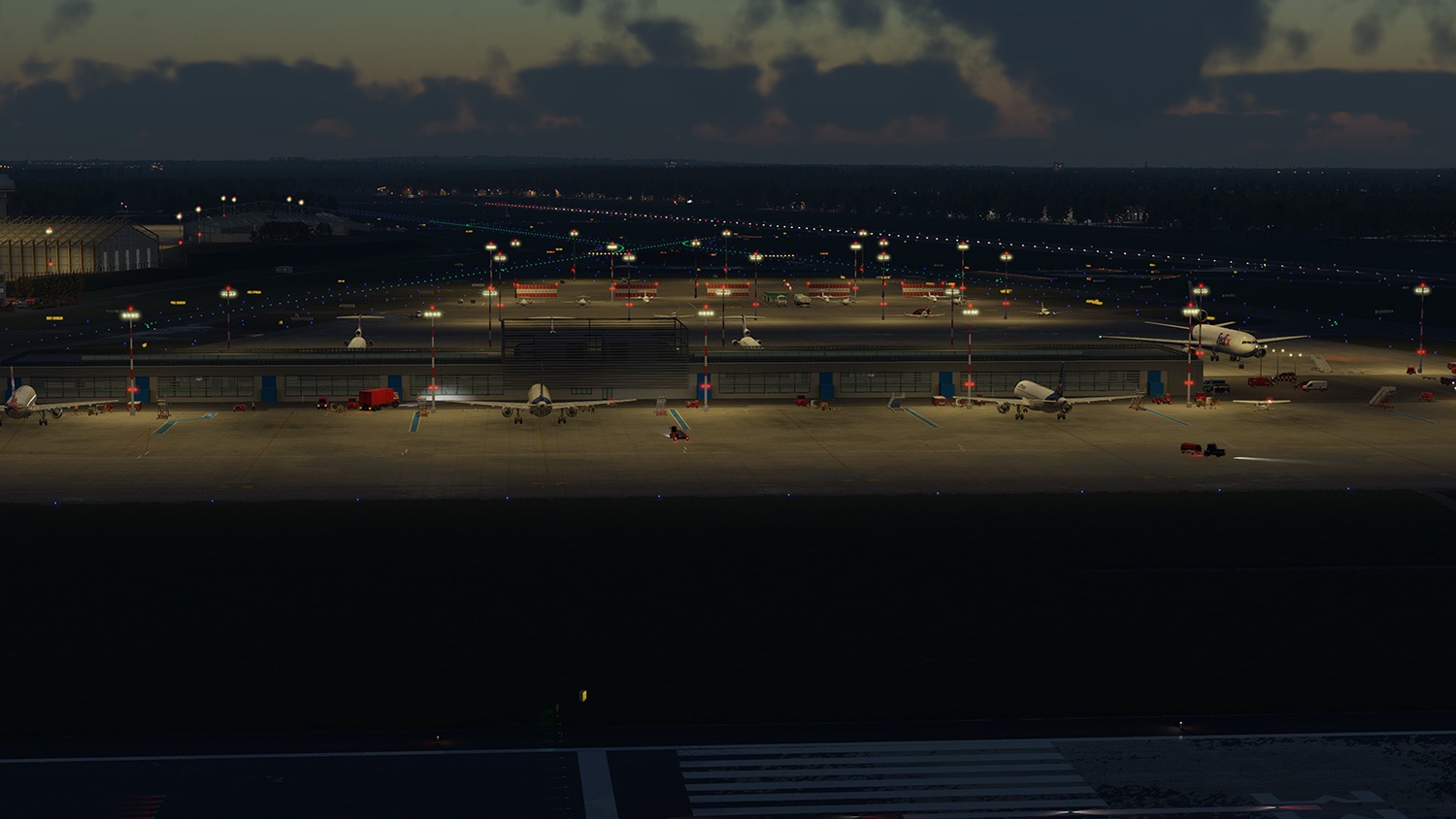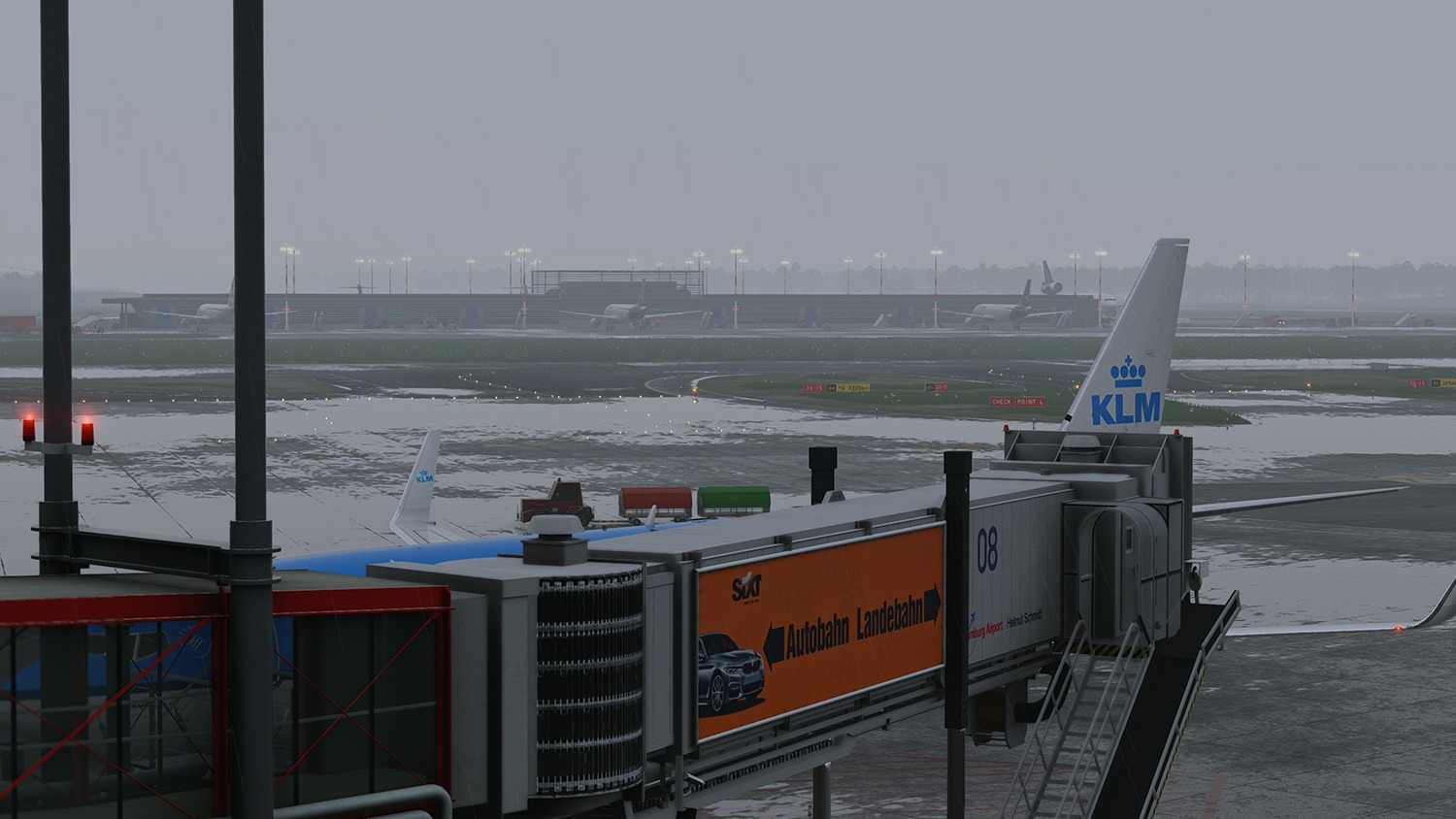 Die Szenerie beinhaltet animierte Fluggastbrücken, Marshaller, Treppenfahrzeuge und Visual Docking Guidance Systems (VDGS), die mit SAM3 oder OpenSAM betrieben werden können. Eine realistische, dynamische Nachtbeleuchtung trägt zusätzlich zu einem lebendigen Erscheinungsbild bei.