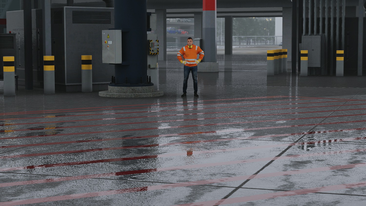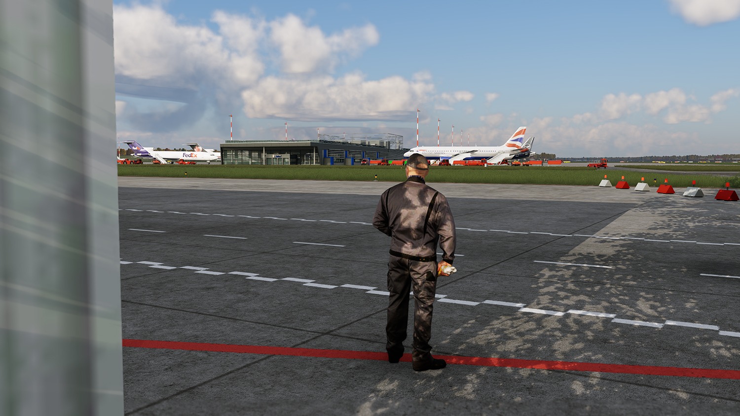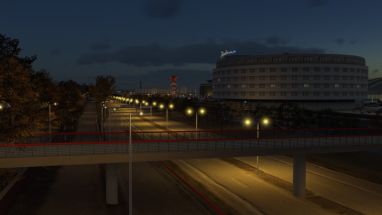 Die Szenerie beinhaltet animierte Fluggastbrücken, Marshaller, Treppenfahrzeuge und Visual Docking Guidance Systems (VDGS), die mit SAM3 oder OpenSAM betrieben werden können. Eine realistische, dynamische Nachtbeleuchtung trägt zusätzlich zu einem lebendigen Erscheinungsbild bei.