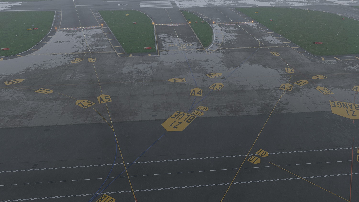 Die Vegetation wurde mithilfe der 3D-Vegetationstechnologie von X-Plane 12 exakt platziert. Volumetrisches Gras ist farblich an die Luftbilder angepasst. Die Szenerie unterstützt vollständig die XP12-eigenen Wettereffekte, inklusive Regen, Schnee und vereisten Flächen. Auch die saisonalen Darstellungen funktionieren ohne zusätzliche Plugins.