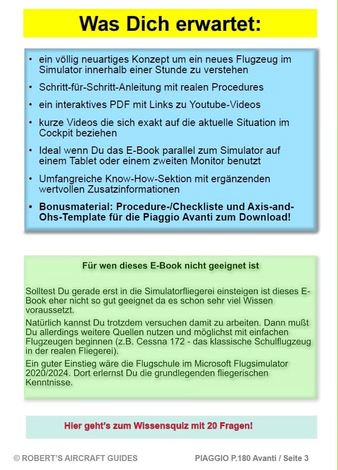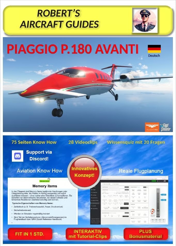 Im Februar veröffentlichte FlightFX die Piaggio P180 Avanti II für den Microsoft Flight Simulator 2020. Der erfahrene Sim-Pilot Robert Talaj hat jetzt ein deutschsprachiges, interaktives E-Book verfasst, das Einsteigern und Fortgeschrittenen den effizienten Umgang mit dem komplexen Business-Flugzeug erleichtert. Herzstück ist eine schrittweise Normal Procedures-Liste mit begleitenden Kurzvideos.
