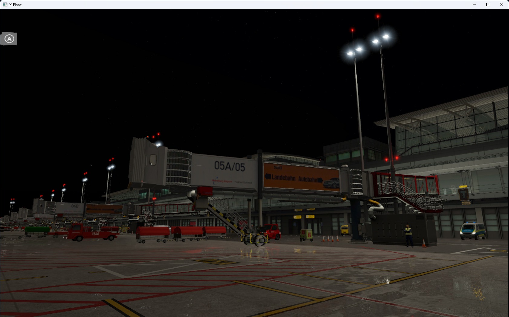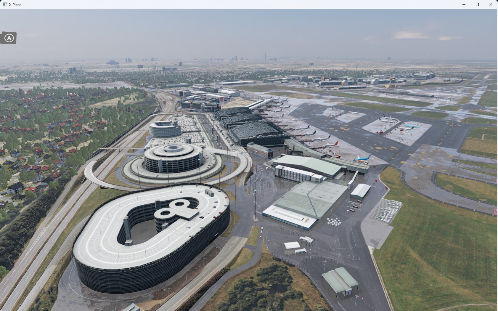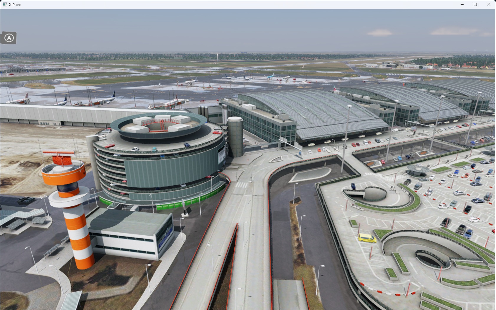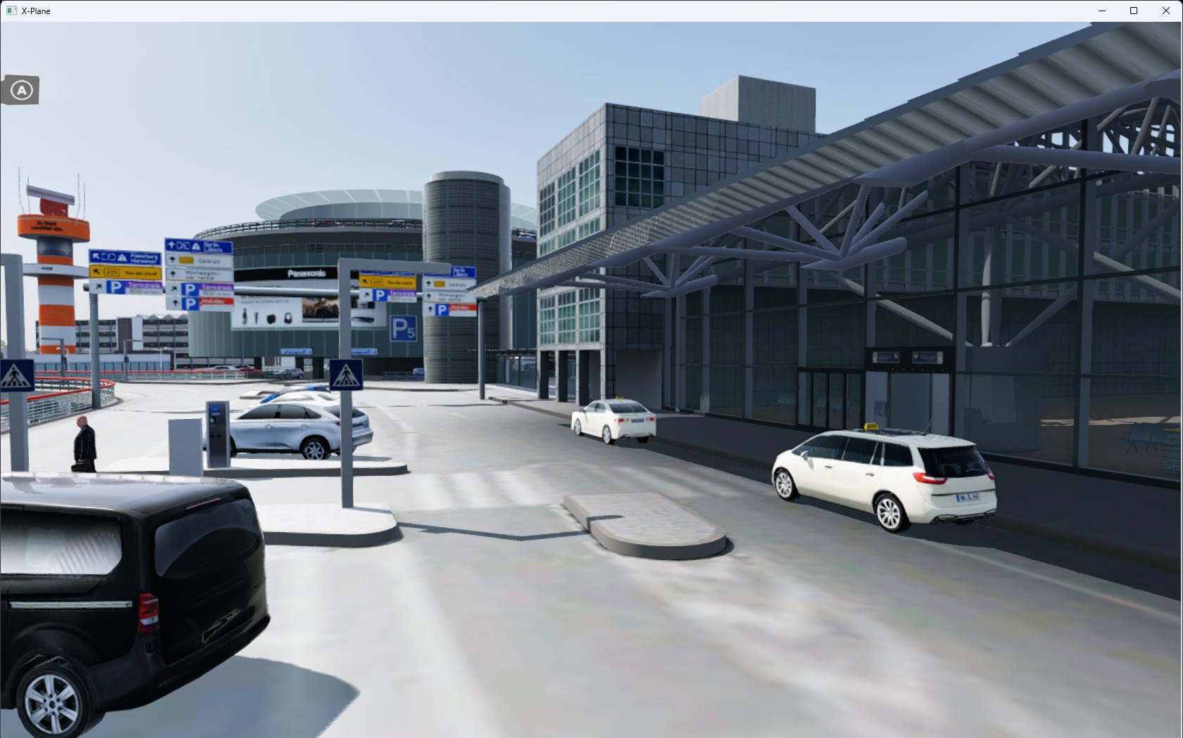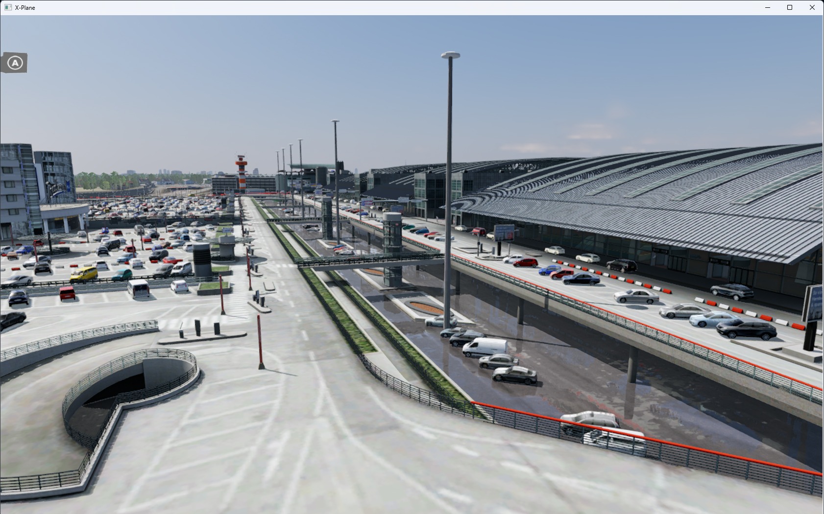Die Landseite wurde zusätzlich zur Luftseite detailliert umgesetzt – einschließlich der Parkhäuser und des Untergeschosses. Die Beleuchtung ist stimmig und plausibel ausgefallen, der Bodenverkehr ebenfalls. Die Performance ist selbst bei Verwendung von größeren und großen Flugzeugen untadelig.
