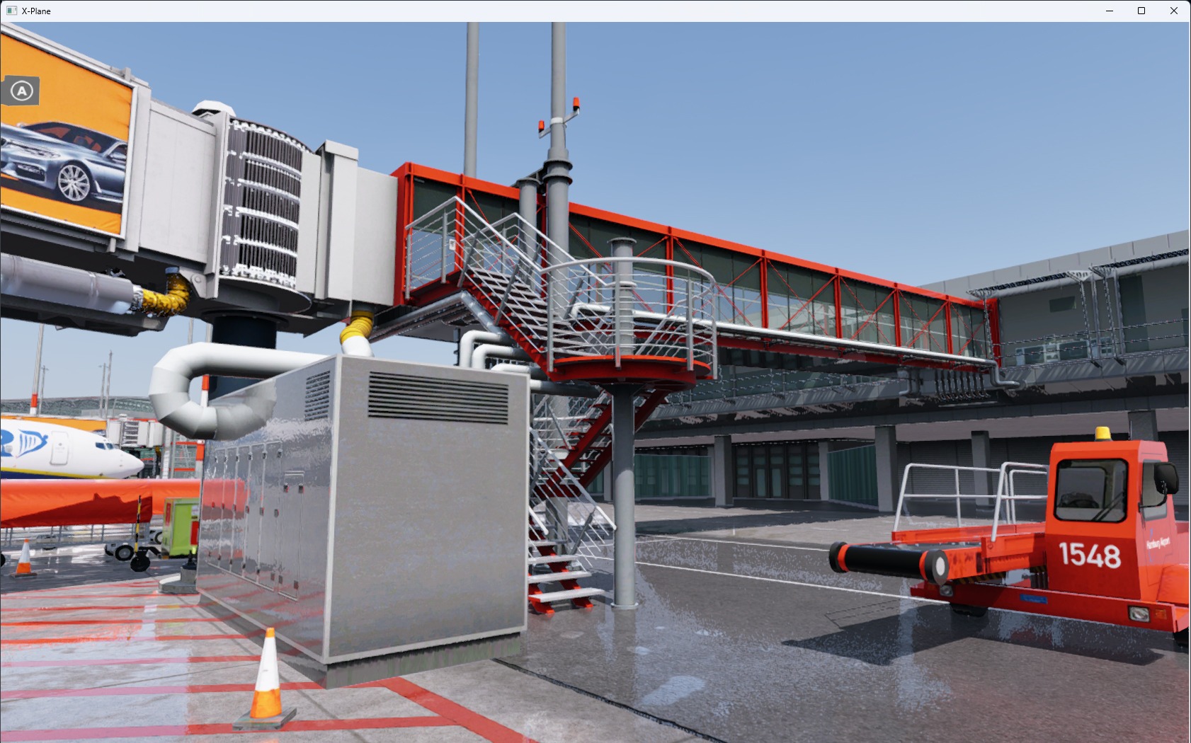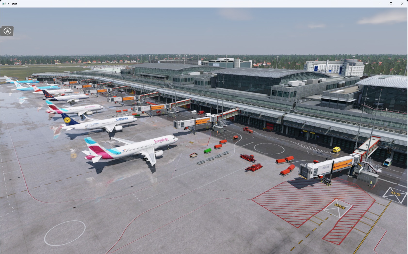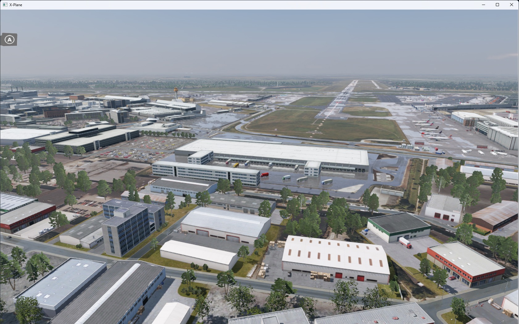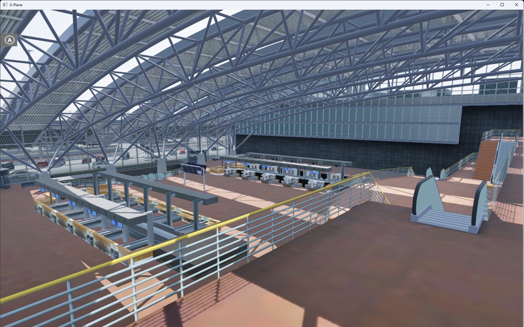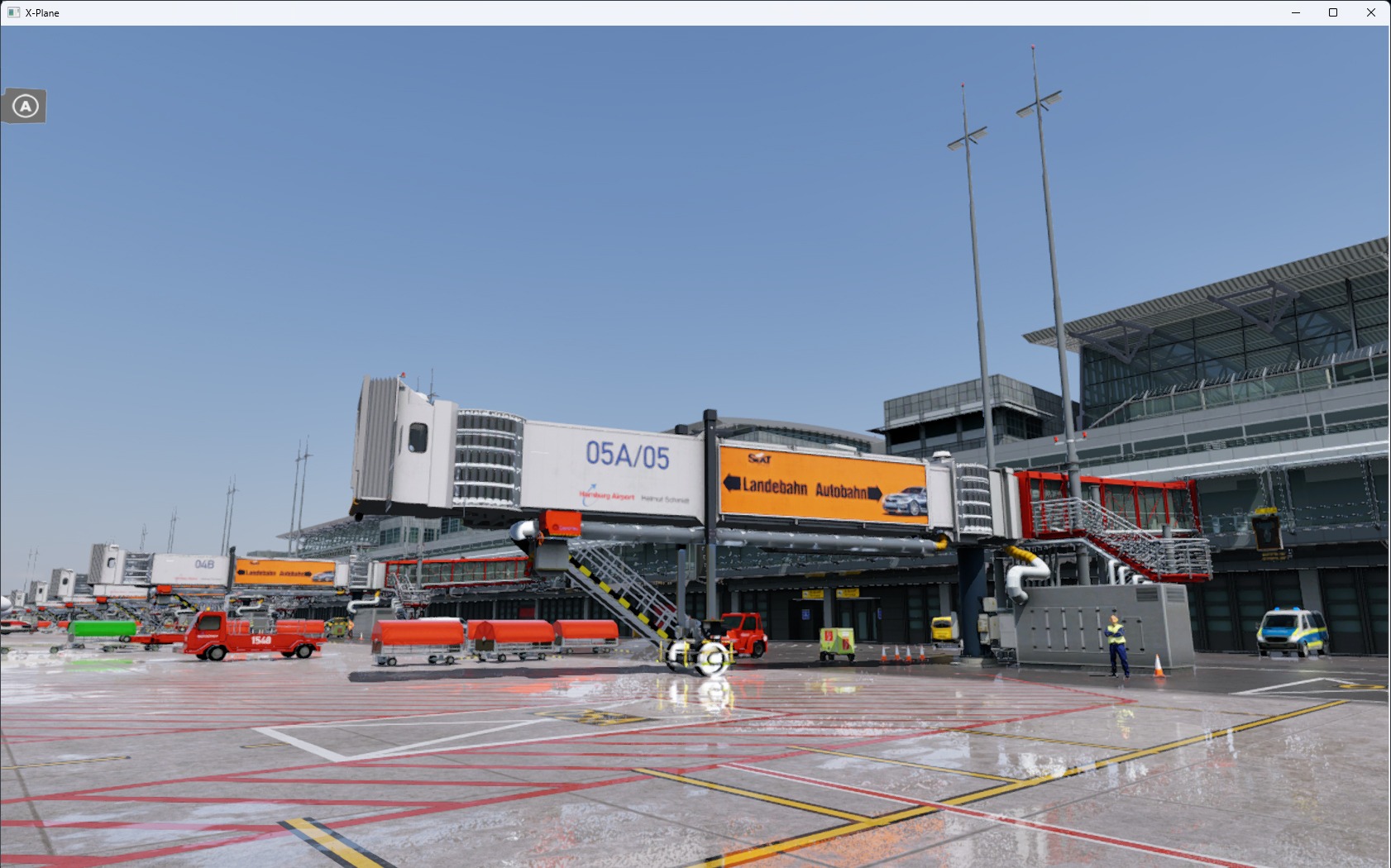 Die Landseite wurde zusätzlich zur Luftseite detailliert umgesetzt – einschließlich der Parkhäuser und des Untergeschosses. Die Beleuchtung ist stimmig und plausibel ausgefallen, der Bodenverkehr ebenfalls. Die Performance ist selbst bei Verwendung von größeren und großen Flugzeugen untadelig.