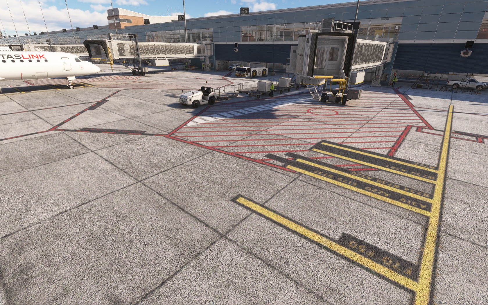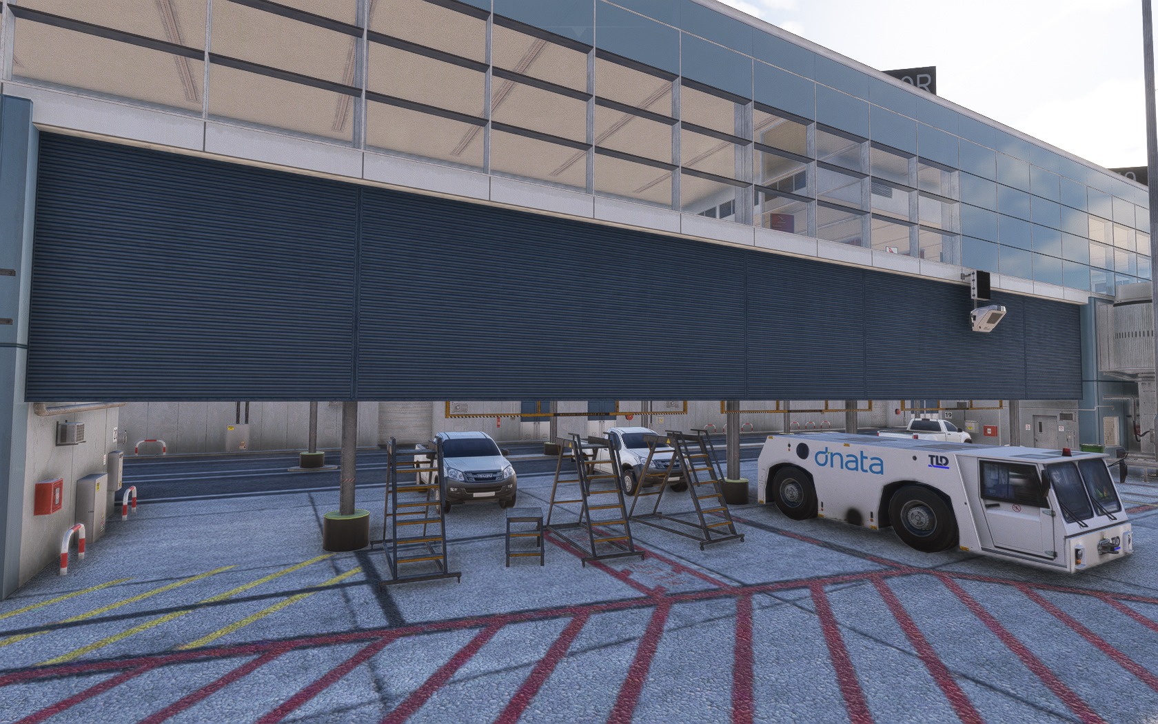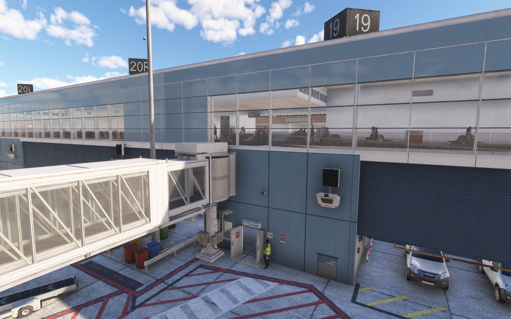 Einige animierte Fahrzeug rollen umher. Die Jetways docken neben dem eigenen an AI-FLugzeuge an. Erstmals kommt in einer Szenerie von den MK Studios das neue Visual Docking Guidance System (VDGS) des Typs Safegate FleX zum Einsatz, welches real von ADB Safegate gebaut wird. Es besteht aus einer Anzeigentafel und einer Lasermesseinrichtung darunter.