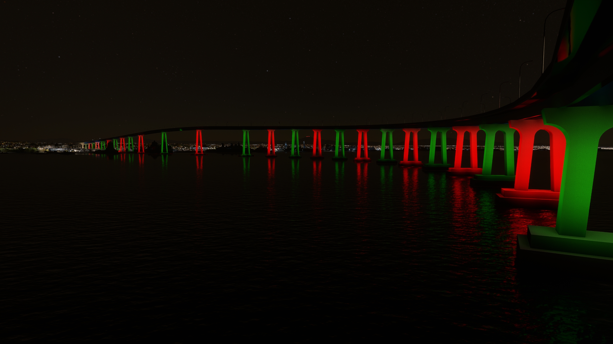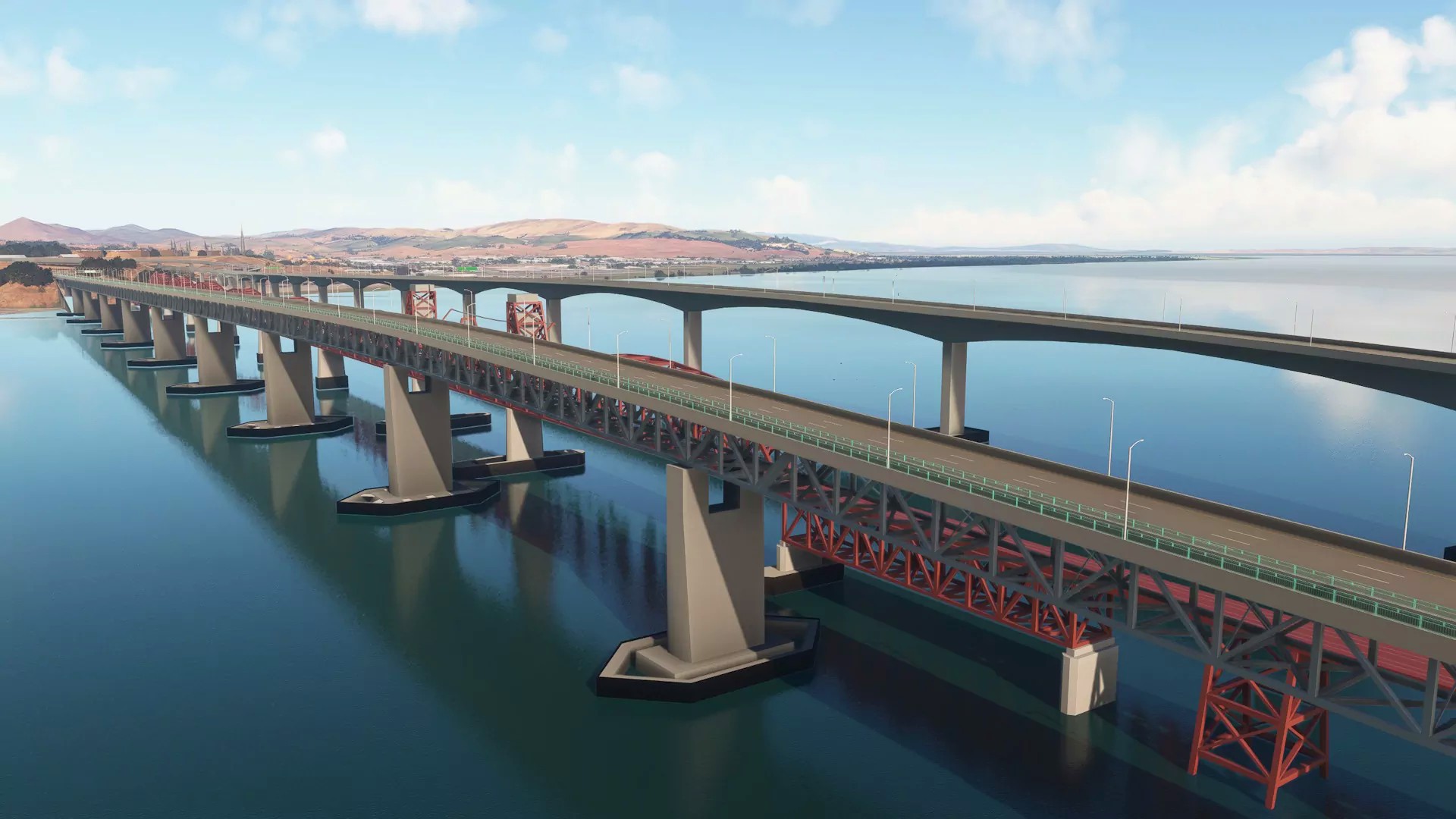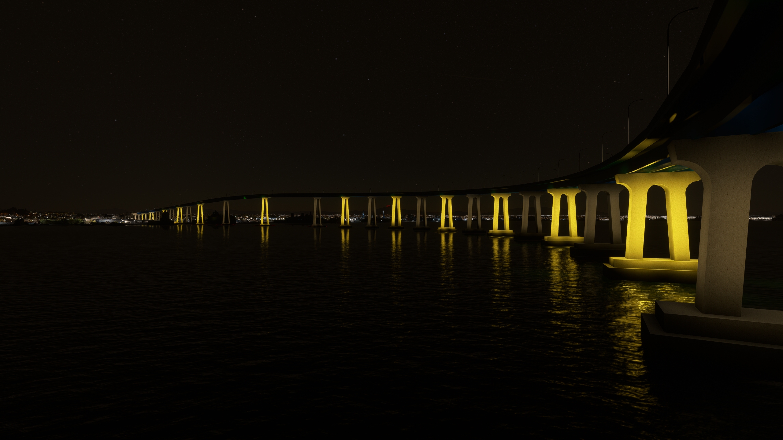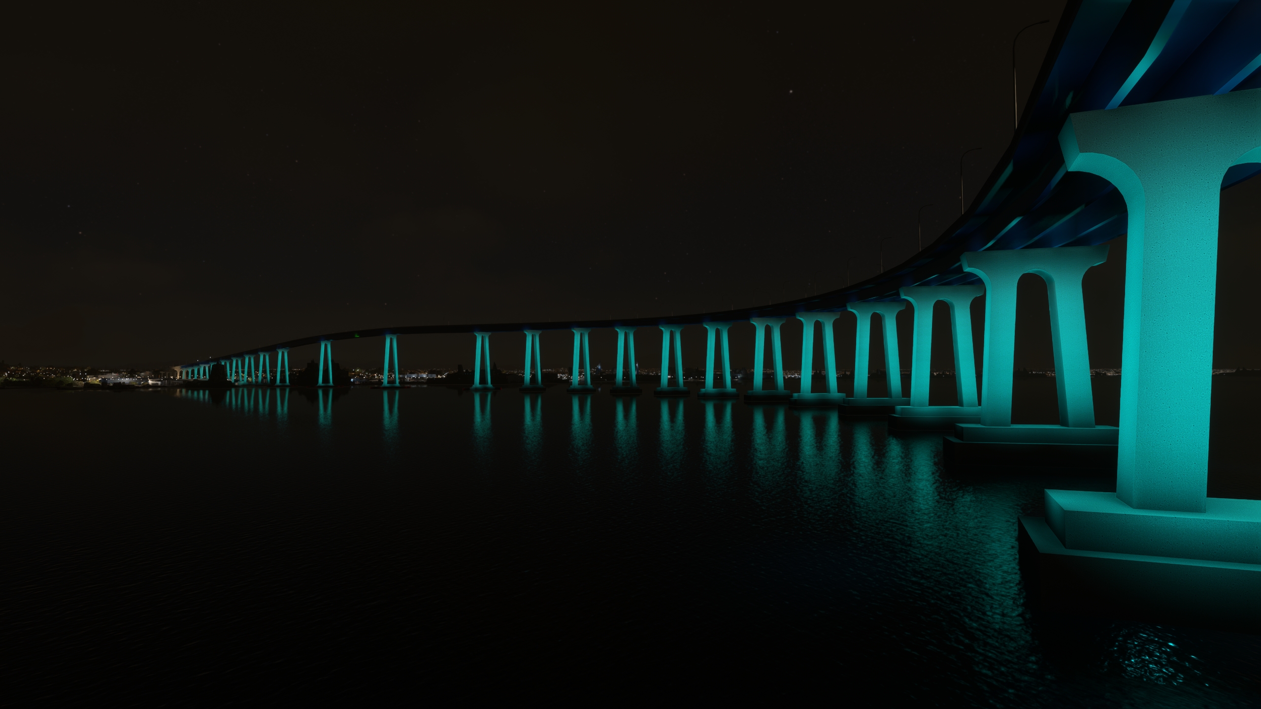 Beide Label lehnen sich bei ihren Umsetzungen jeweils für MSFS 2020 und MSFS 2024 eng an die Realität an und beleuchten die Brücken, deren reale Vorbilder ebenfalls nachts angestrahlt werden. Ein wenig stört, dass unter den Brücken an Land oft „Spiegelungen“ der Straßen auf dem Boden zu sehen, was technisch bedingt und nur mit hohem Aufwand zu retuschieren ist.