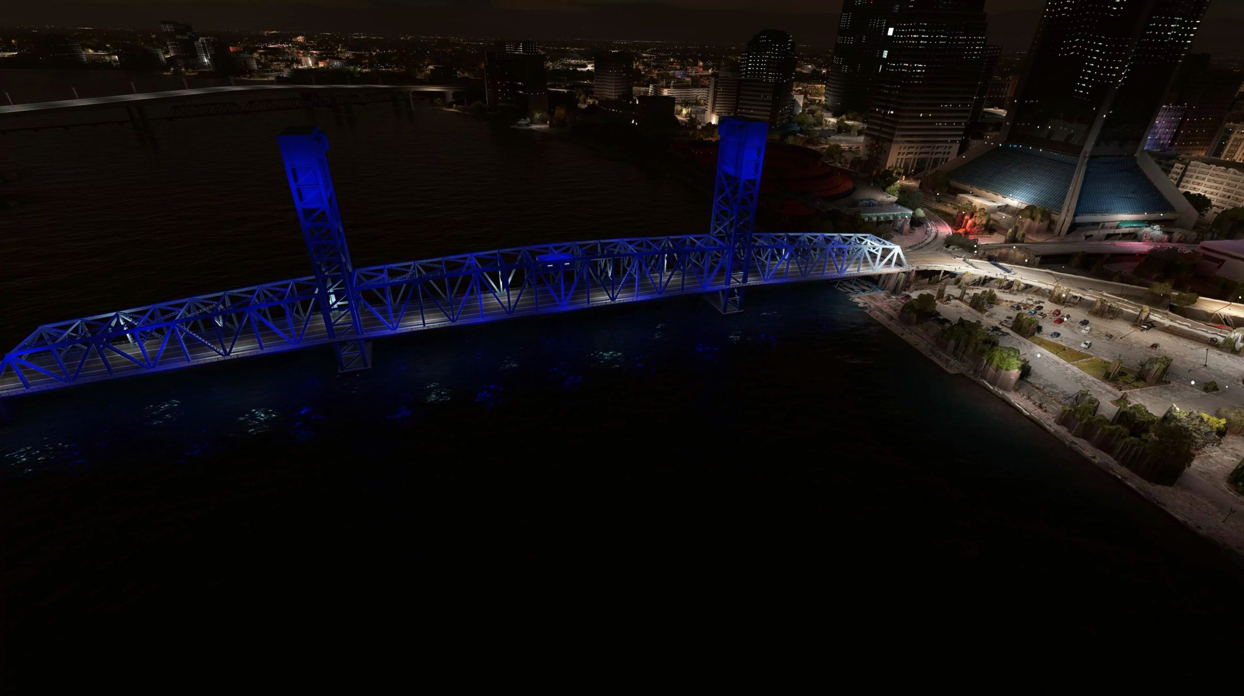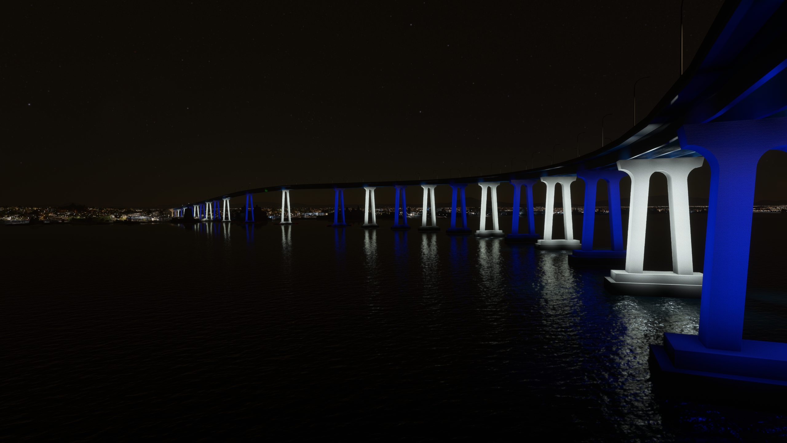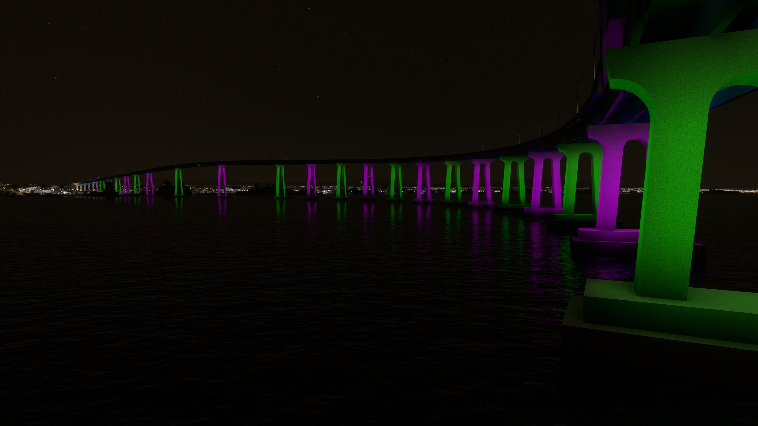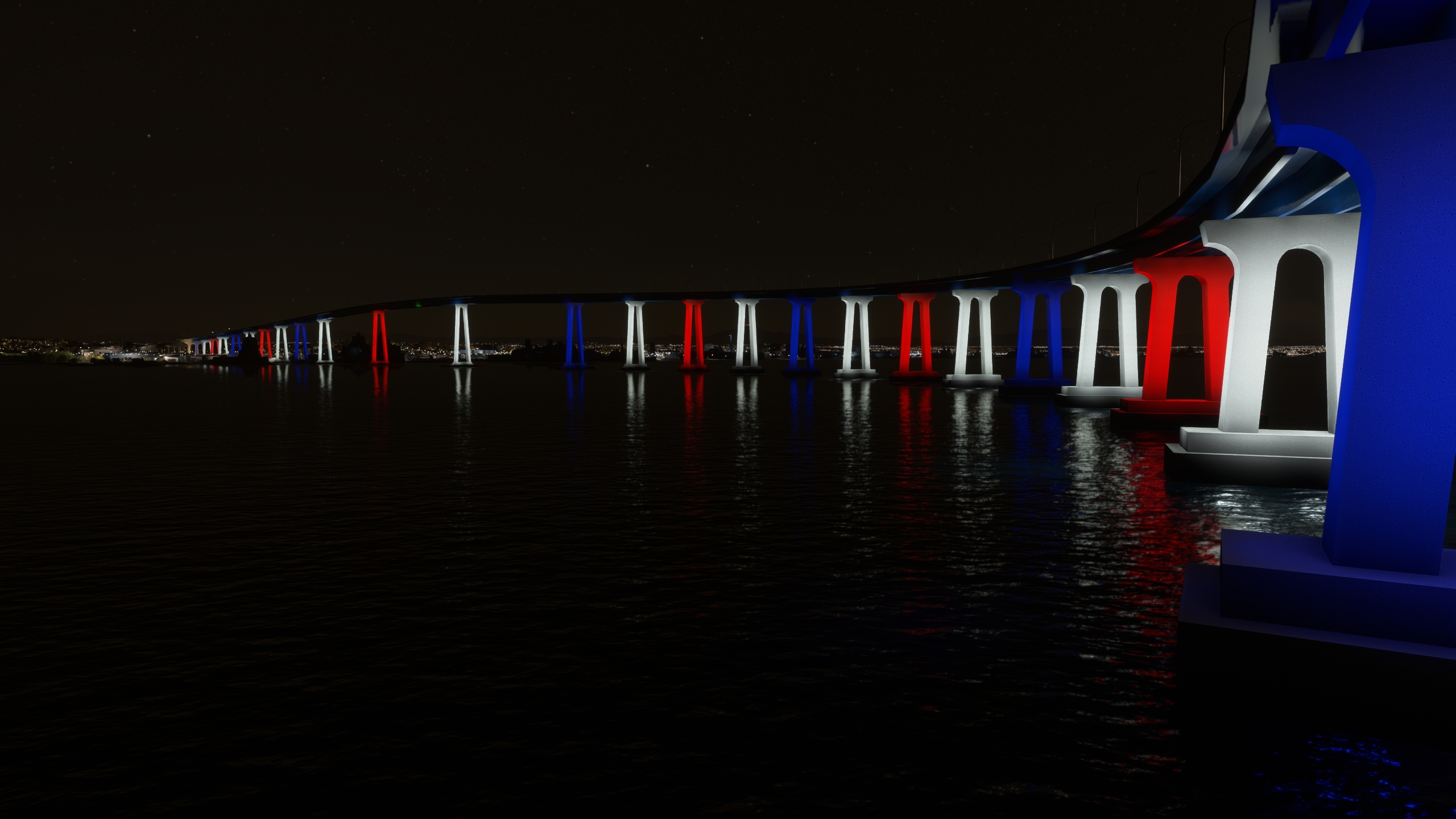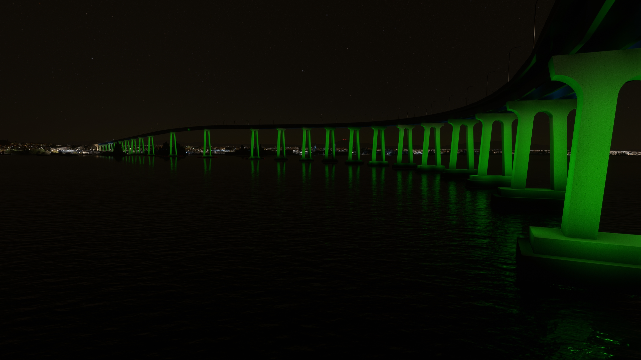 Beide Label lehnen sich bei ihren Umsetzungen jeweils für MSFS 2020 und MSFS 2024 eng an die Realität an und beleuchten die Brücken, deren reale Vorbilder ebenfalls nachts angestrahlt werden. Ein wenig stört, dass unter den Brücken an Land oft „Spiegelungen“ der Straßen auf dem Boden zu sehen, was technisch bedingt und nur mit hohem Aufwand zu retuschieren ist.
