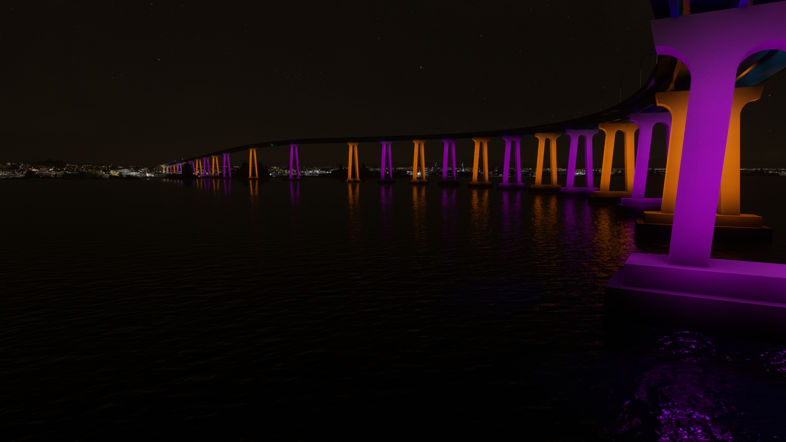 Für die Coronado Brücke in San Diego hält LPC neun verschiedene Beleuchtungsvarianten bei Contrail bereit wie „Hanukah“, „Mardi Gras“, „Patriotisch“ und „Weihnachten“ – hier die diversen Lichteffekte im Bild:
