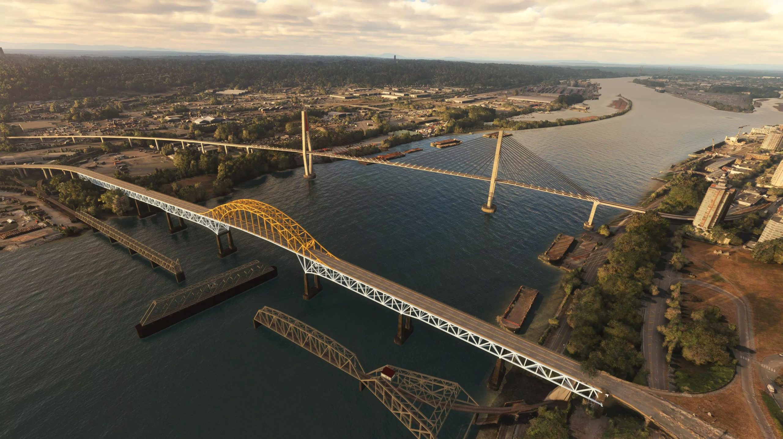 Brücken: Auch im MSFS 2024 immer noch weitgehend „hässlich“… Aufgenommen von Radarsatelliten, die die Brücken von „oben“ betrachten. Da deren Radarstrahlen nur auf, nicht aber durch die Brücken sehen können, entstehen oft von den Seiten betrachtet dichte Brückenkörper, die zumindest aus niedrigeren Sichtflughöhen betrachtet nicht wirklich gut aussehen. Ein Beispiel dafür ist die Interstate Bridge über Columbia River nördlich von Portland, die im Anflug von Nordwesten auf den Portland International Airport mit dem ICAO-Code KPDX (in der v2 meisterlich gemacht von iBlueYonder im Vertrieb von FlightBeam Studios) überflogen wird.